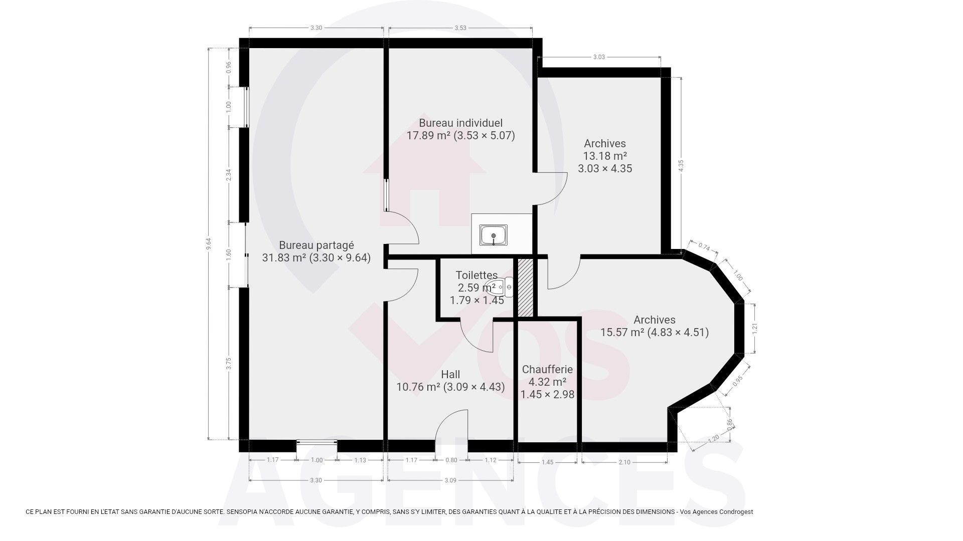 Composition : espace d’accueil, WC indépendant, grand espace de bureaux, un bureau principal et deux espaces de stockage/rangement.