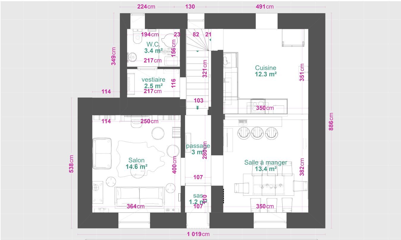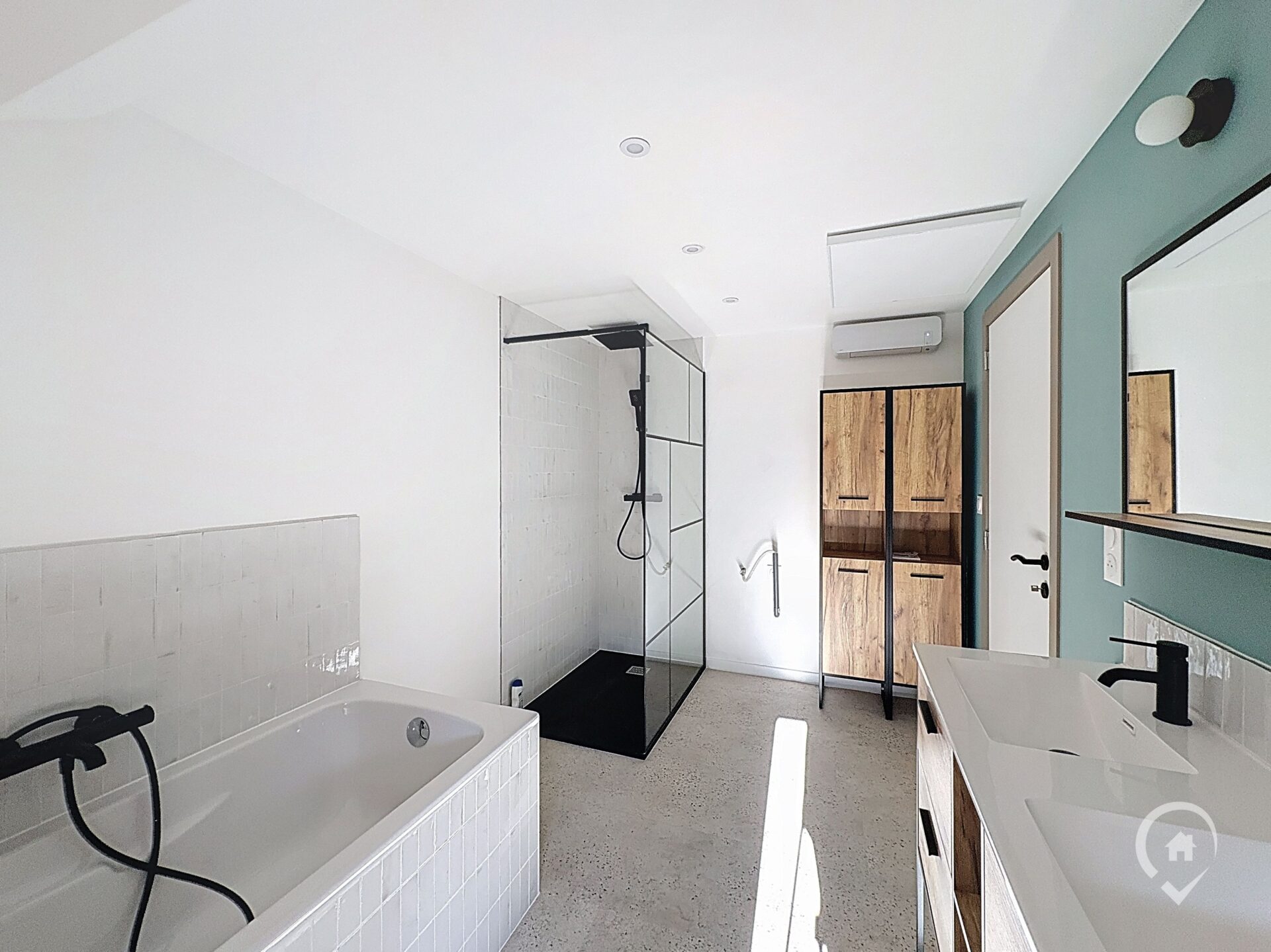 – Rez-de-chaussée : hall d’entrée chaleureux donnant accès à un vaste séjour comprenant le salon et la salle à manger, cuisine équipée et ouverte sur le séjour, une buanderie et WC indépendant ;