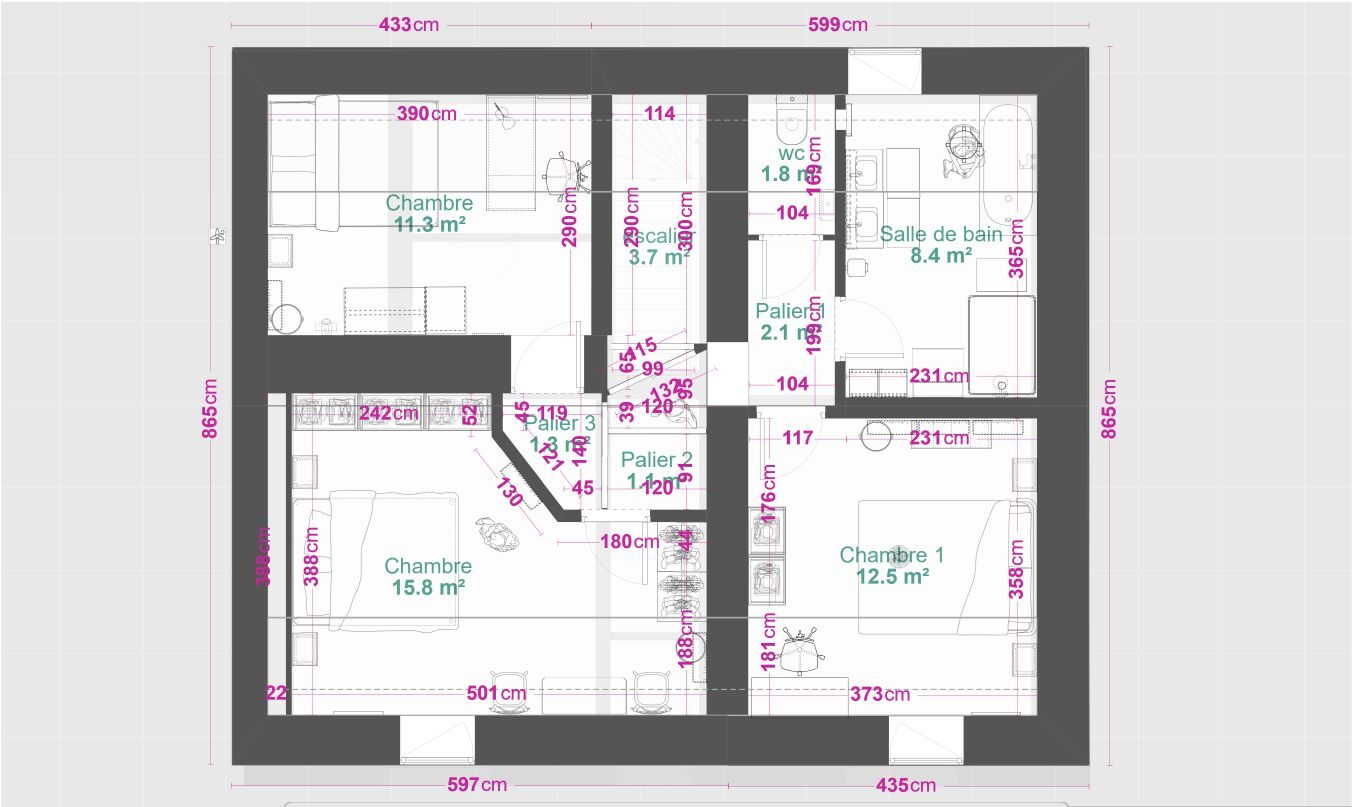 – 1er étage : hall de nuit, 3 chambres, un WC individuel, accès aux 2greniers via l’une des chambres et une salle de bains (baignoire + douche);
