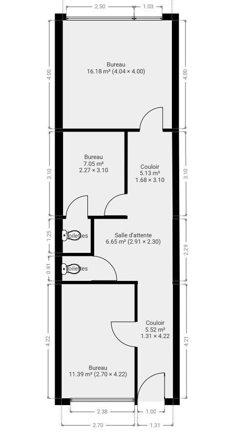 Composition : entrée, cabinet médical, une salle d’attente (idéalement entre les 2 cabinets), WC indépendant destiné aux patients, bureau avec WC privatif, second cabinet médical.