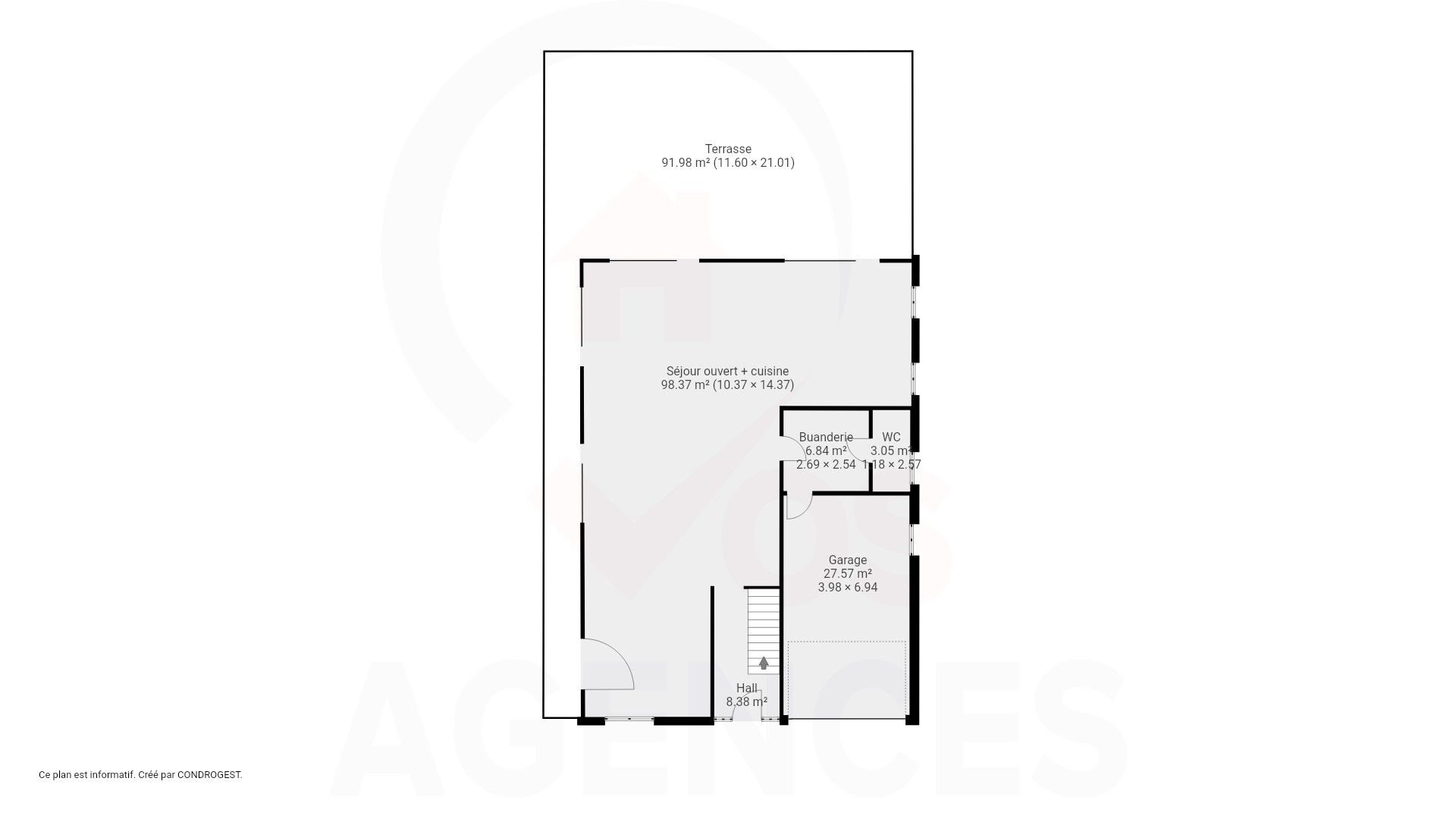 – Rez-de-chaussée : grand et lumineux séjour ouvert sur la cuisine et la salle à manger (100 m²), une buanderie, un WC indépendant et un grand garage ;