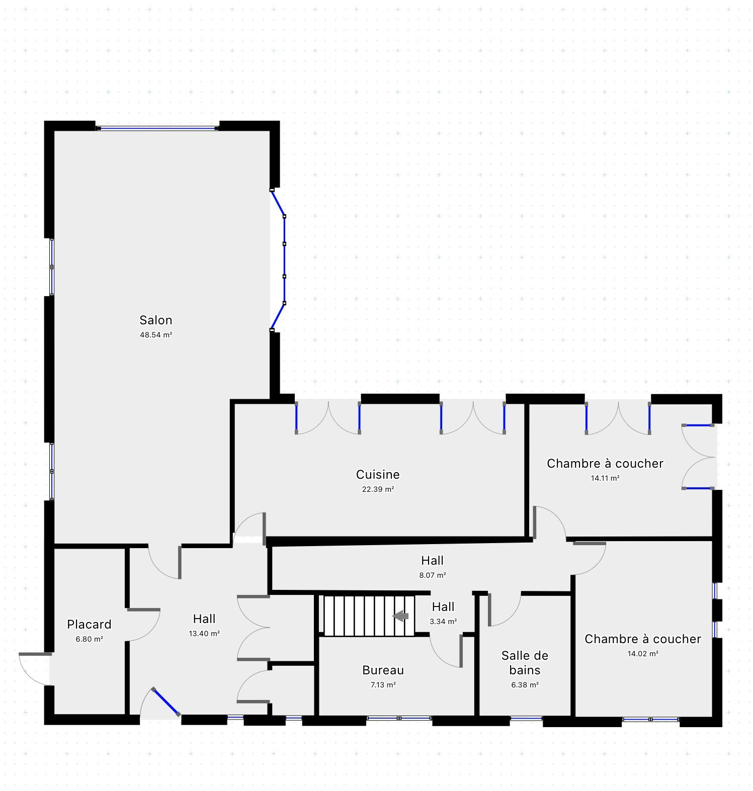 – Rez : hall, living, cuisine, buanderie, bureau, 2 chambres, salle de bain ;