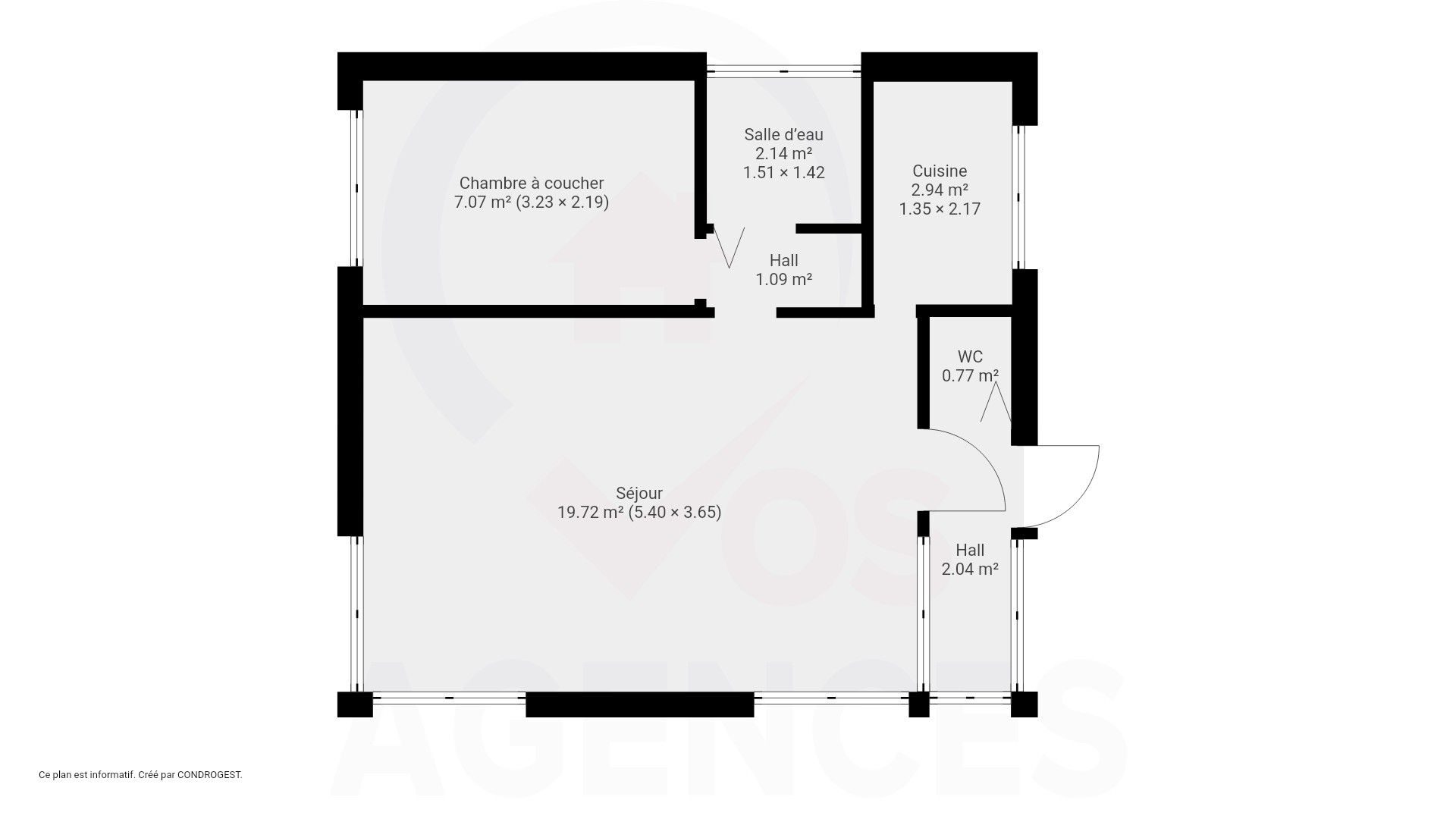 Composition : hall d’entrée avec vestiaire et WC, un agréable séjour, une cuisine, une chambre et une salle d’eau.