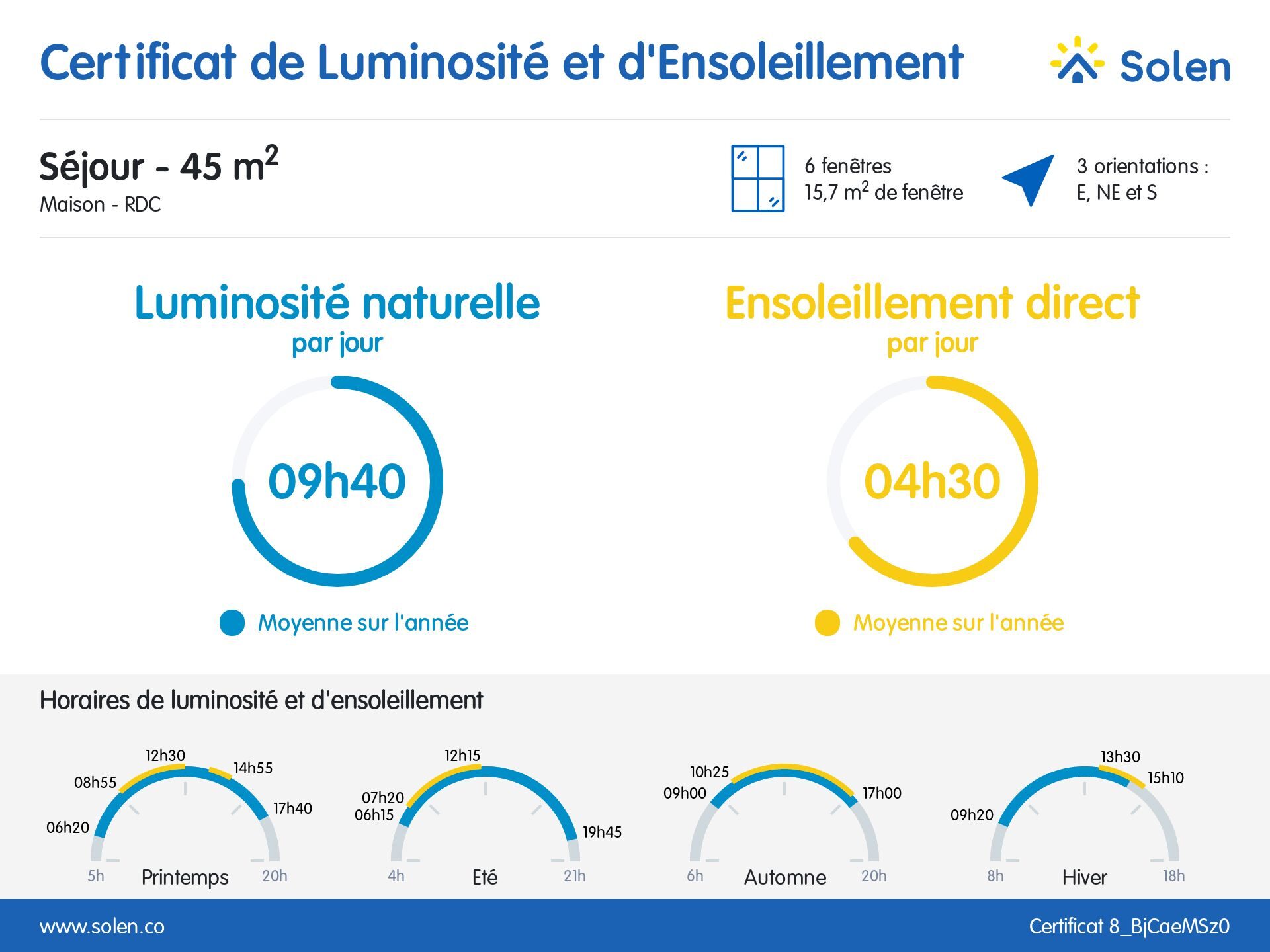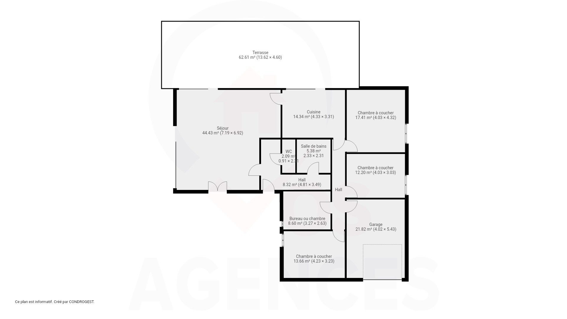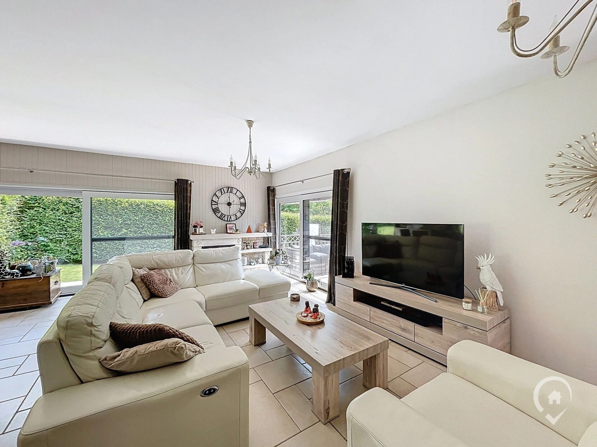 Rez-de-chaussée: hall d’entrée, spacieux et lumineux séjour, cuisine équipée, hall de nuit, 3 chambres + 1 bureau (ou chambre d’enfant), une salle de douche, un garage et un WC indépendant