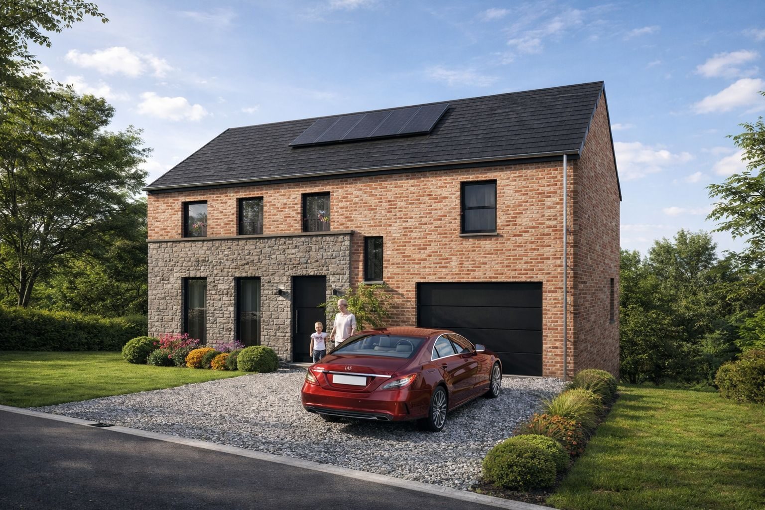 Équipements et avantages : PEB A+ ; panneaux photovoltaïques ; citerne eau de pluie de 4500 litres ; châssis PVC ; chaudière gaz et chauffage sol ; maison vendue clé sur porte.
