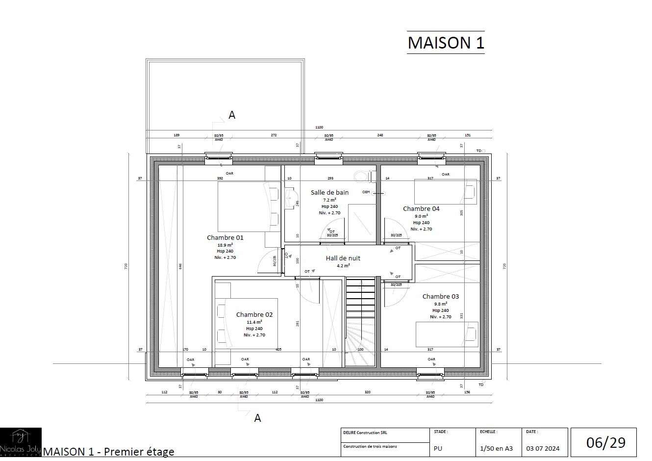 – 1er étage : hall de nuit, 4 chambres (dont une avec dressing) et salle de bain.