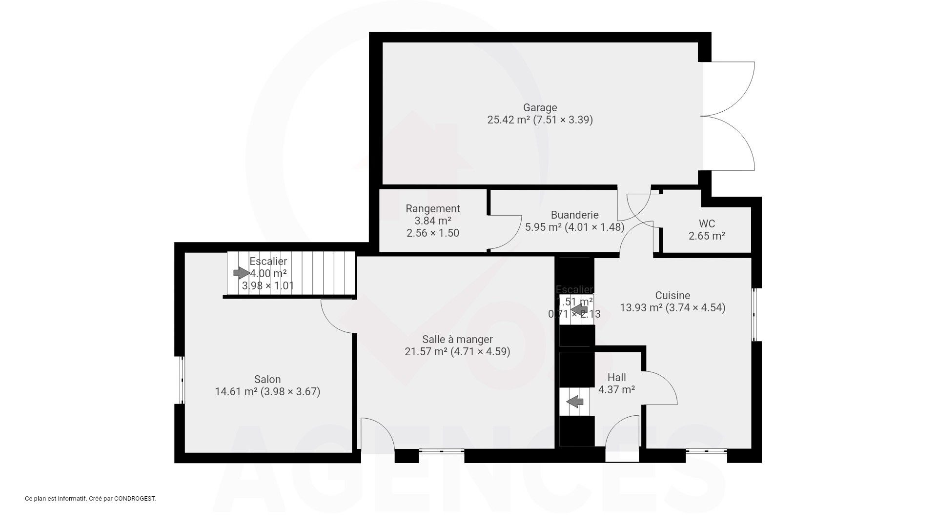 – Rez-de-chaussée: hall d’entrée, salon, salle à manger, cuisine, buanderie, espace de rangement, WC indépendant et garage ;