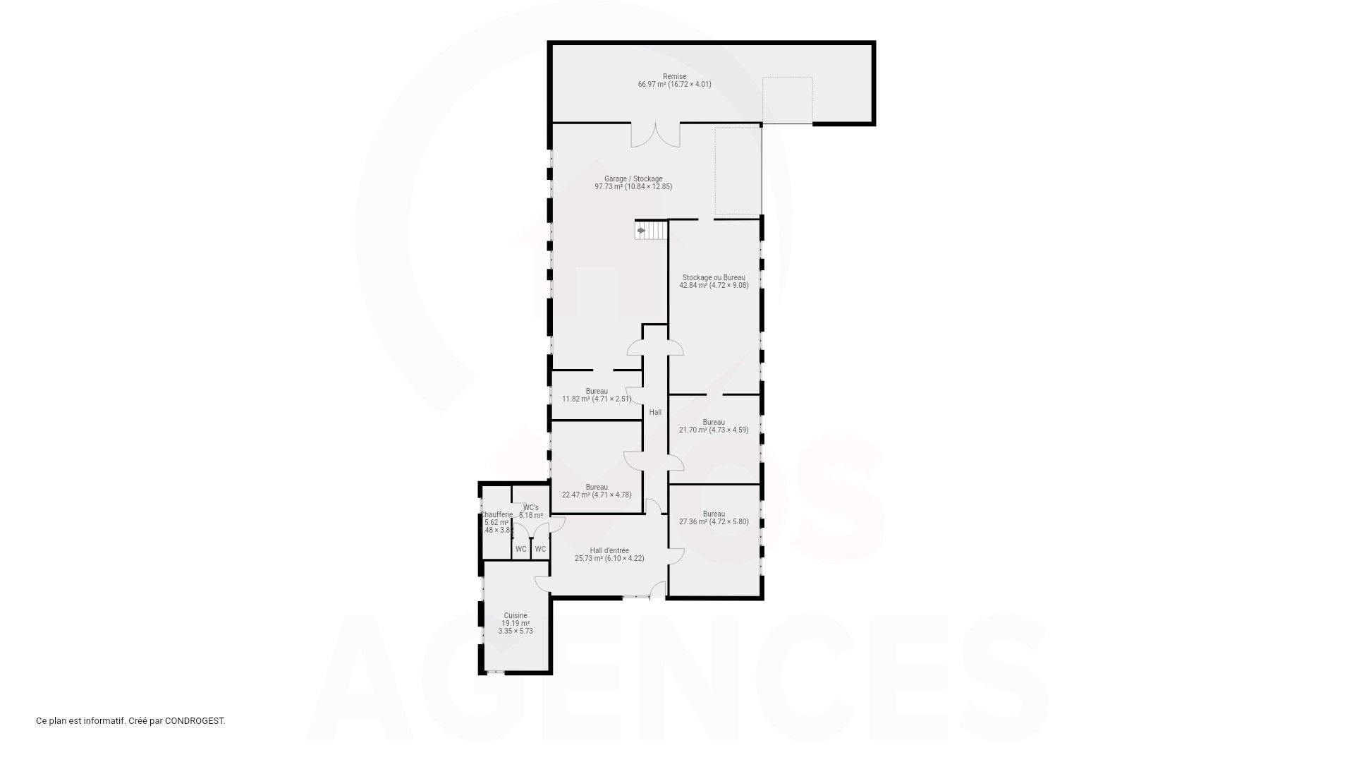 Composition : hall d’accueil, cuisine, 2 WC, local chaufferie, bureaux, garage/ateliers, remise et espace de stockage