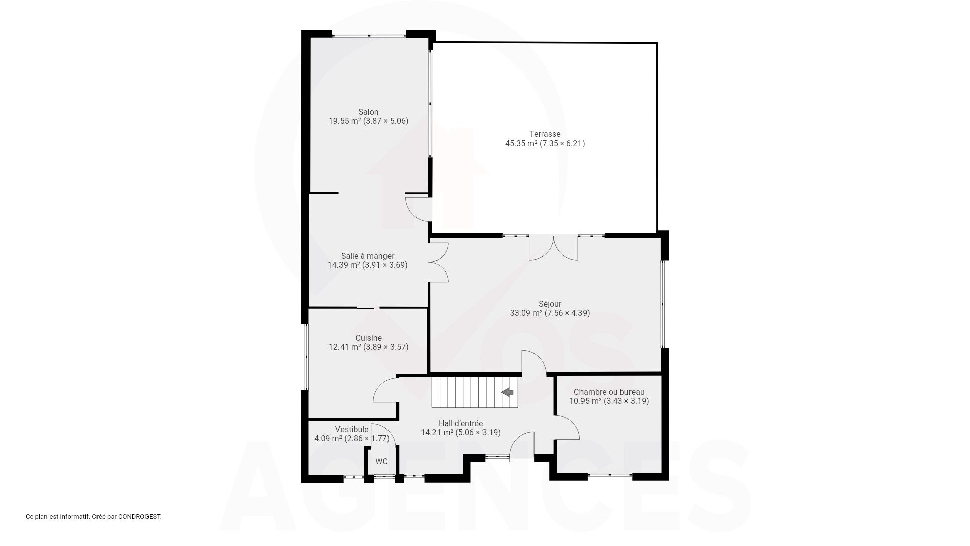 – Rez-de-chaussée: hall d’entrée, chambre (ou bureau), deux espaces séjour, donnant sur une grande terrasse, un salon, une cuisine, un vestibule et un WC indépendant ;