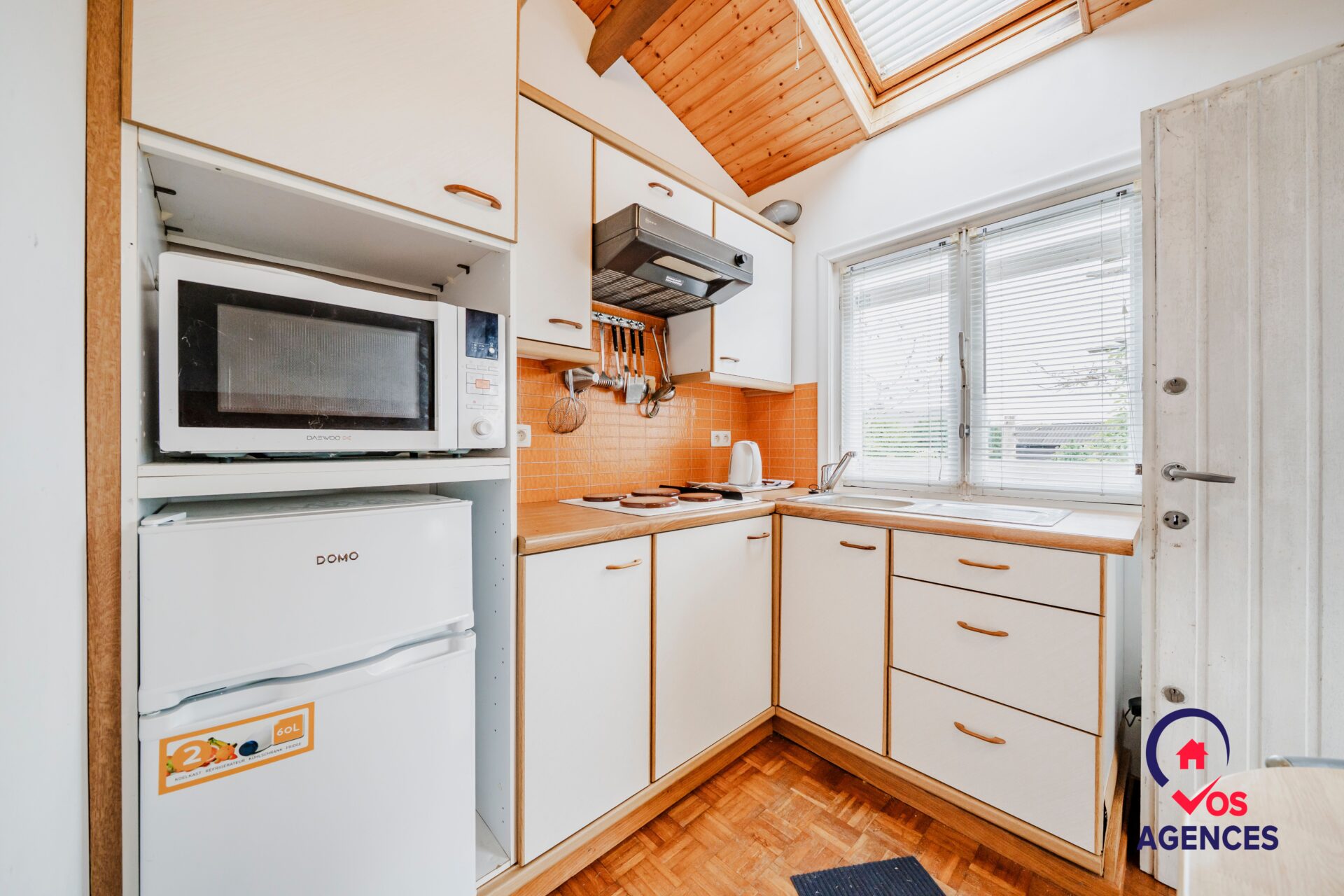 Composition: séjour avec petite terrasse, cuisine semi équipée, 2 chambres et salle de bain.