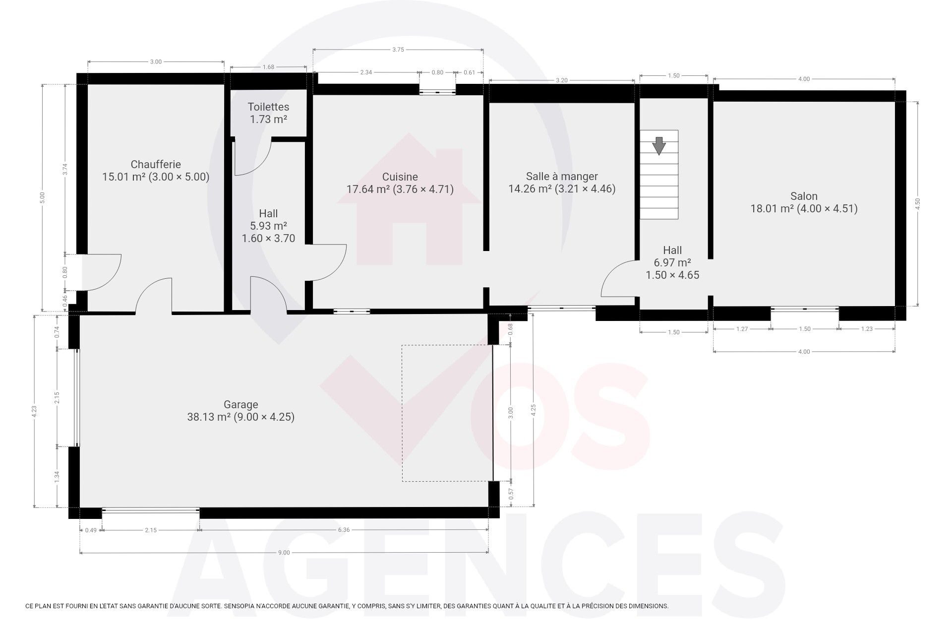 – Rez : hall, salon, salle à manger, cuisine, WC, chaufferie, garage