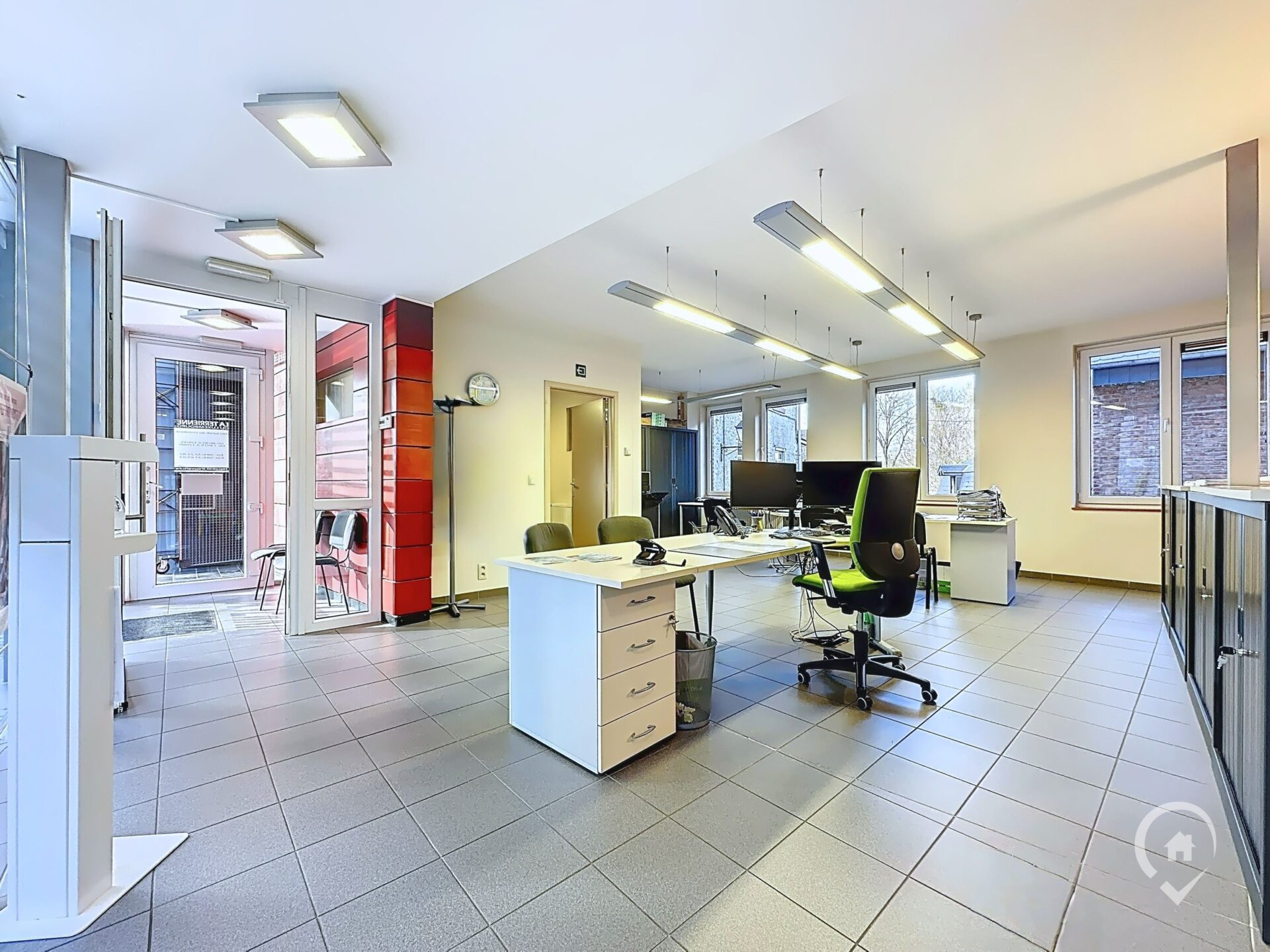 – Rez-de-chaussée – Rue Porte Haute : Sas d’entrée sécurisé, grand open-space, bureau indépendant, accès vers la salle de réunion située à l’étage inférieur.