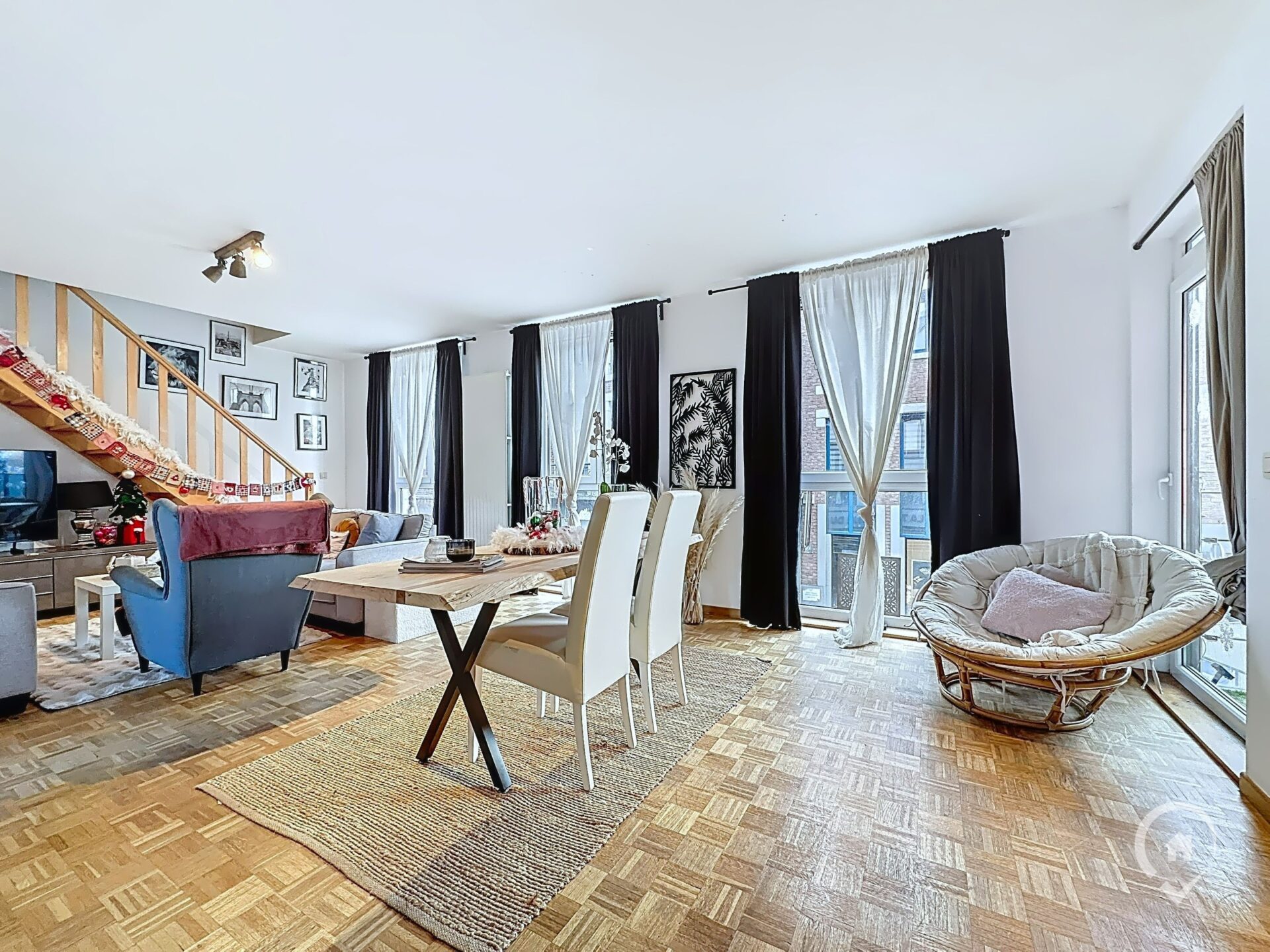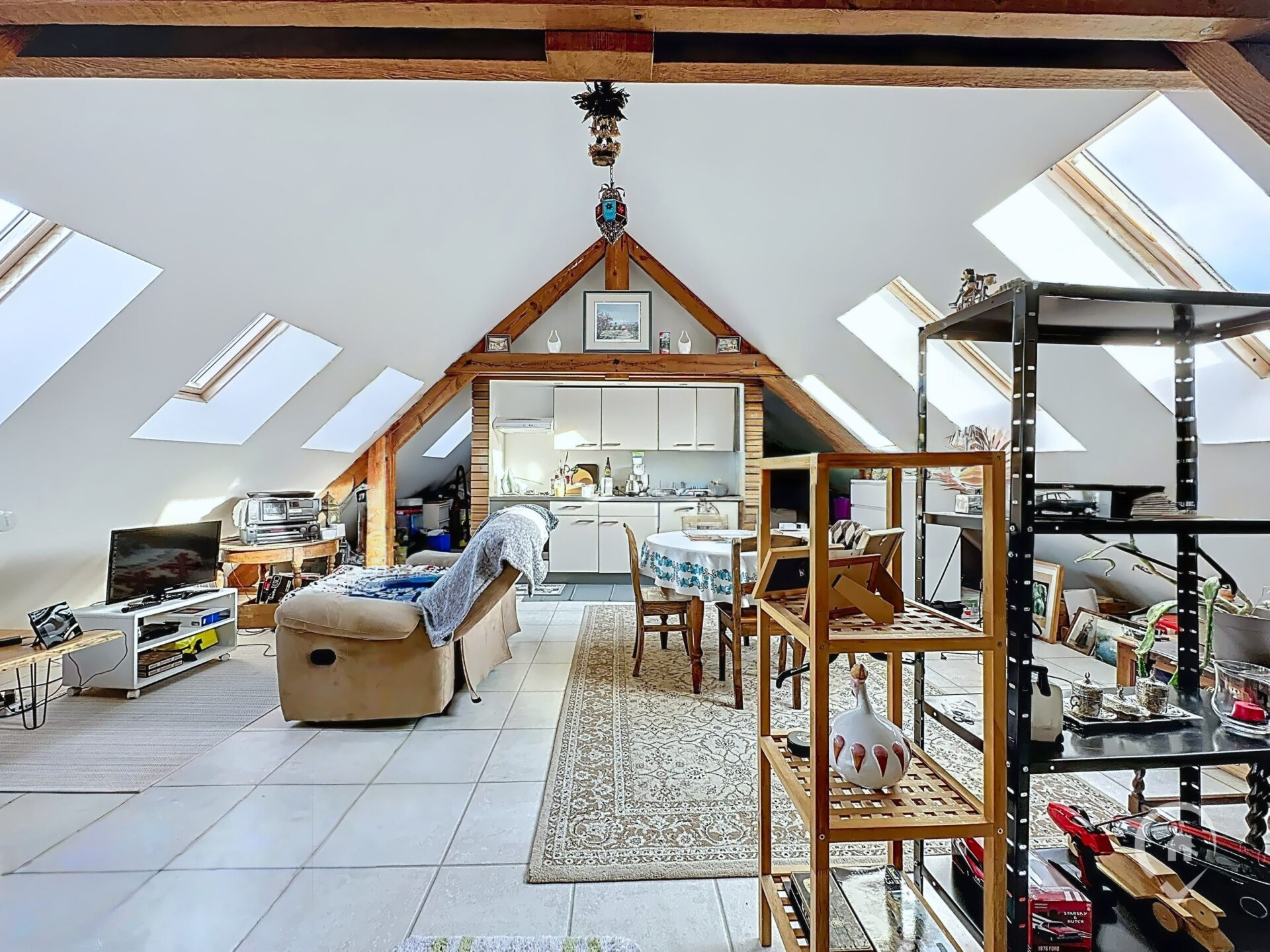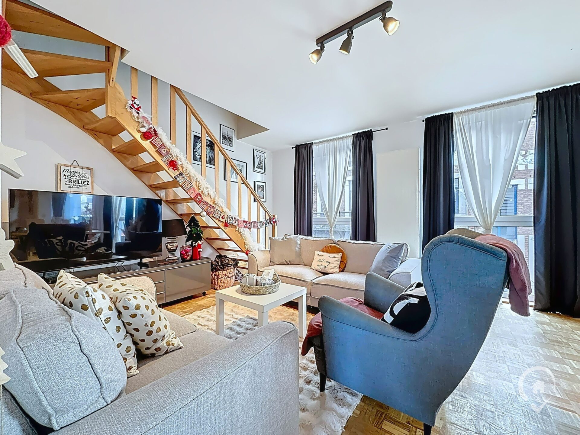 – Rez-de-chaussée : hall d’entrée, WC indépendant, salon, salle à manger, cuisine, balcon avec vue sur la place aux Foires, espace de rangement dans le hall d’entrée du duplex.
