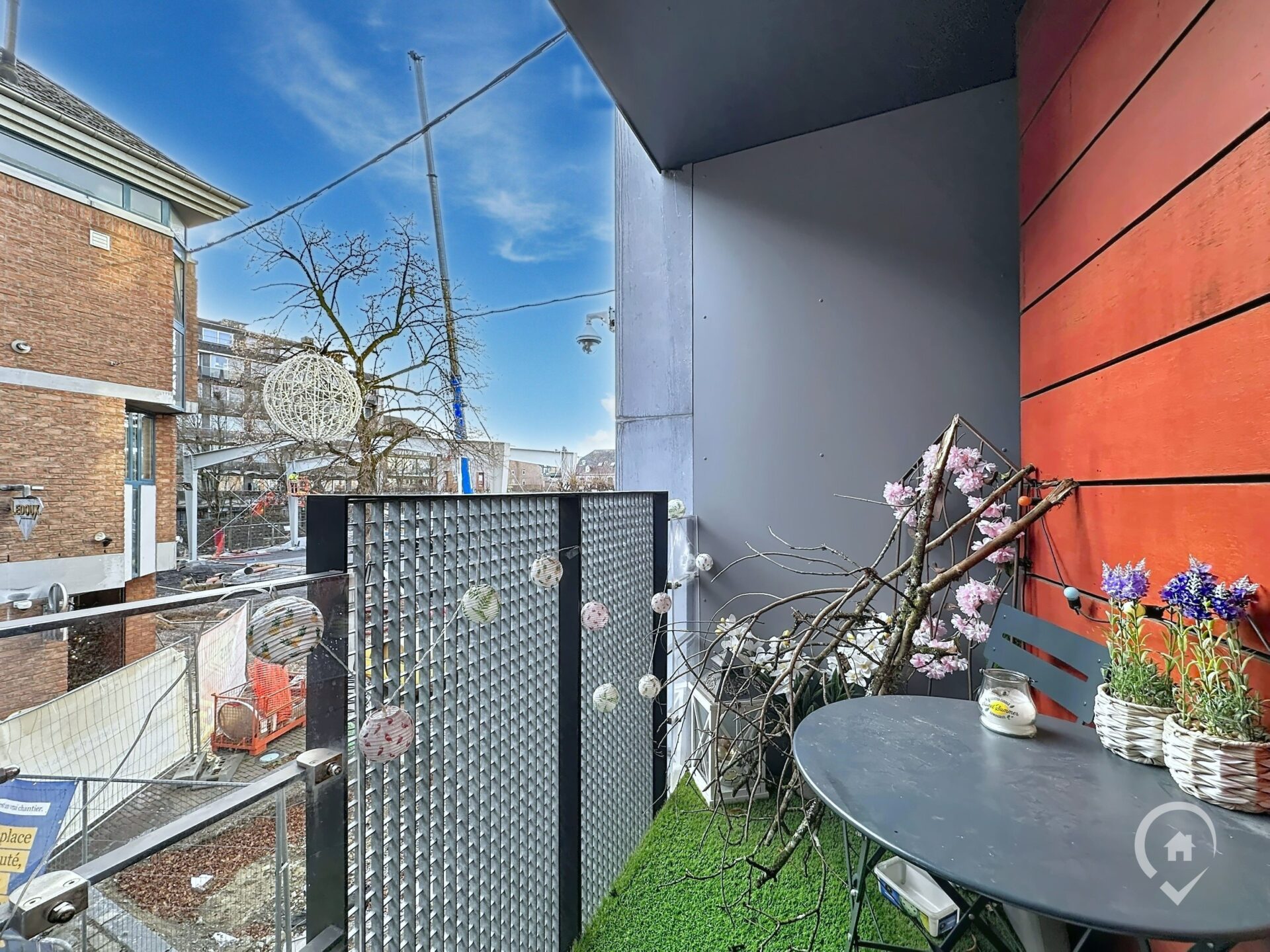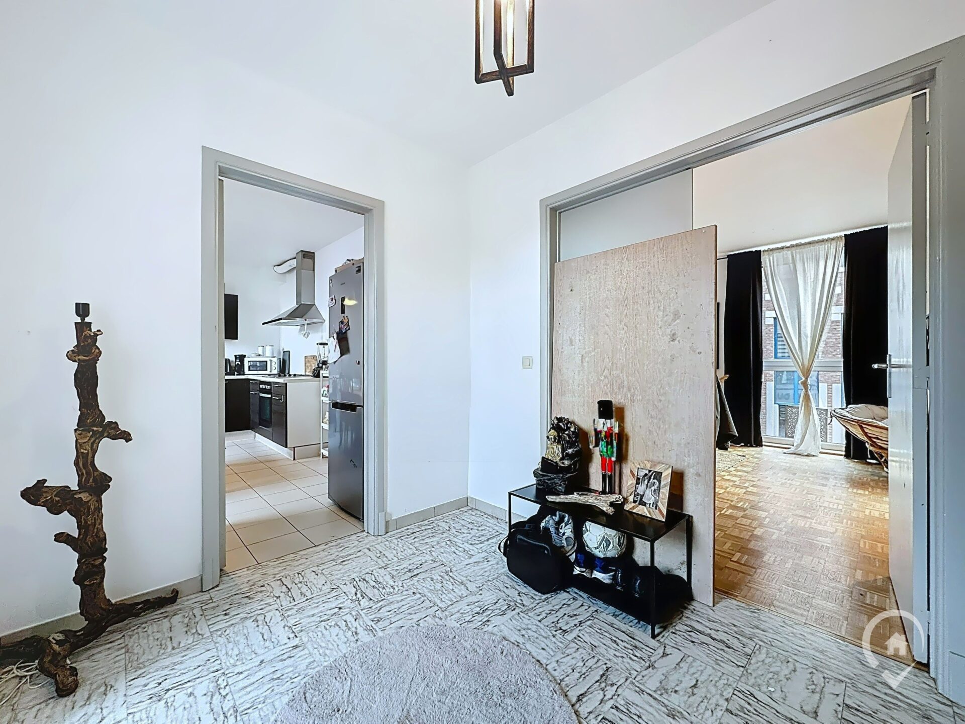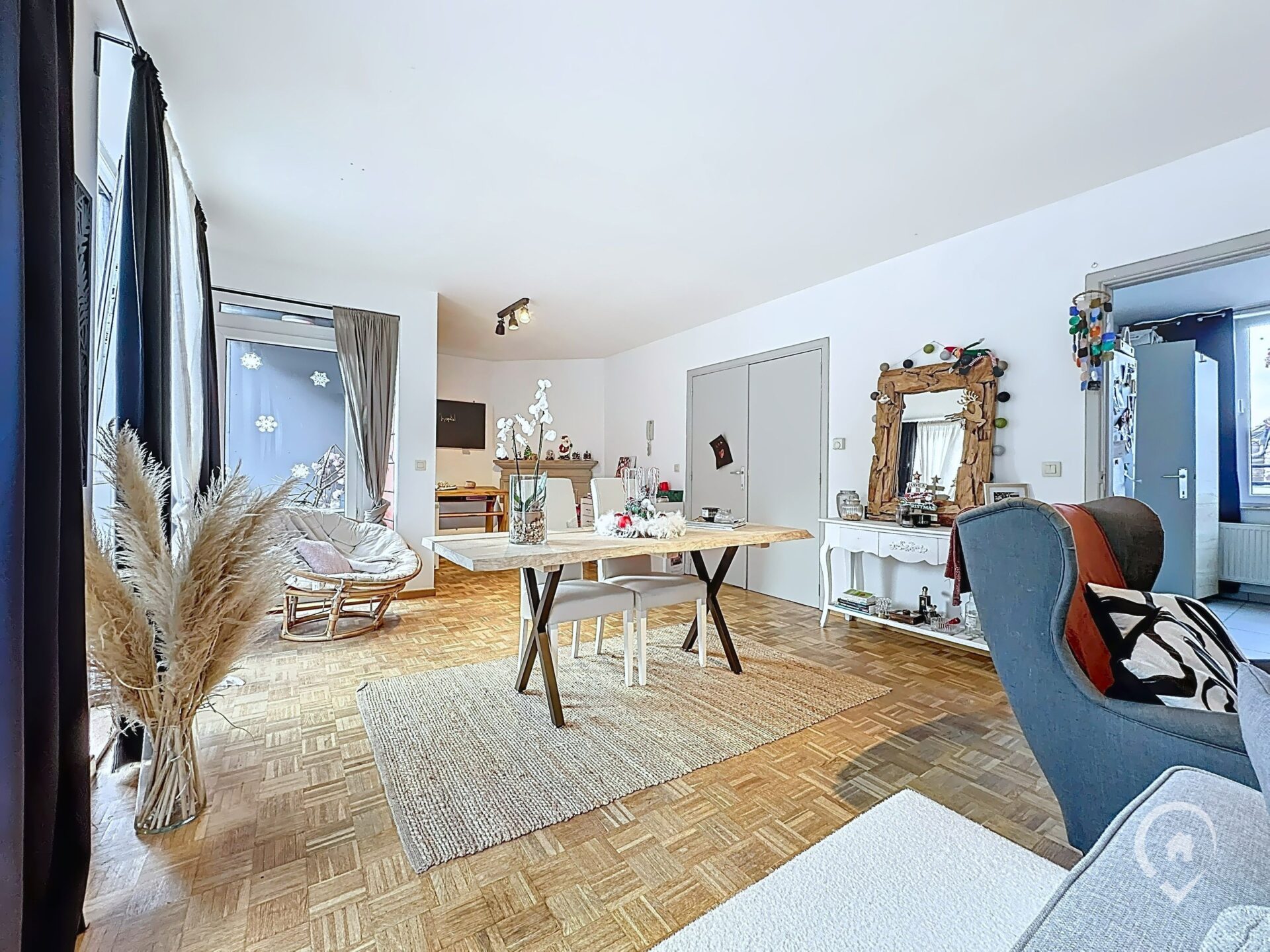 – Rez-de-chaussée : hall d’entrée, WC indépendant, salon, salle à manger, cuisine, balcon avec vue sur la place aux Foires, espace de rangement dans le hall d’entrée du duplex.