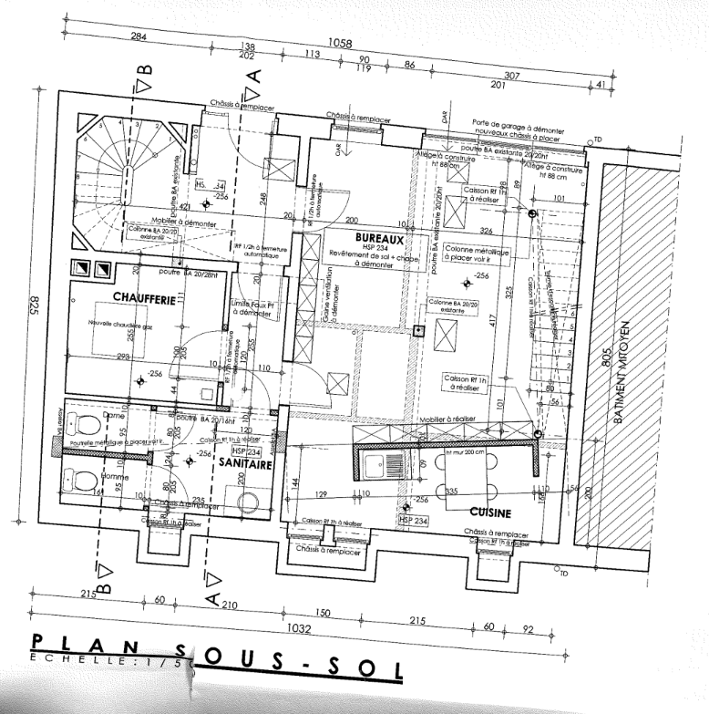 – Rez-de-chaussée – Rue du Matoufé : salle de réunion, cuisine équipée, double WC indépendant, local technique, hall d’entrée commun pour le duplex et le studio, ainsi qu’un accès vers la salle de réunion.