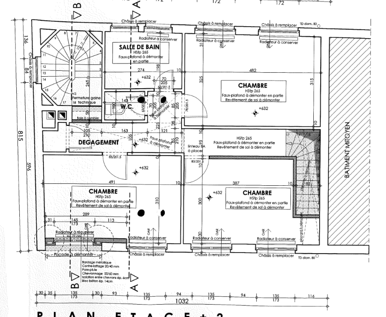 – 1er étage : hall de nuit, 3 grandes chambres, salle de bains avec WC, chaufferie.