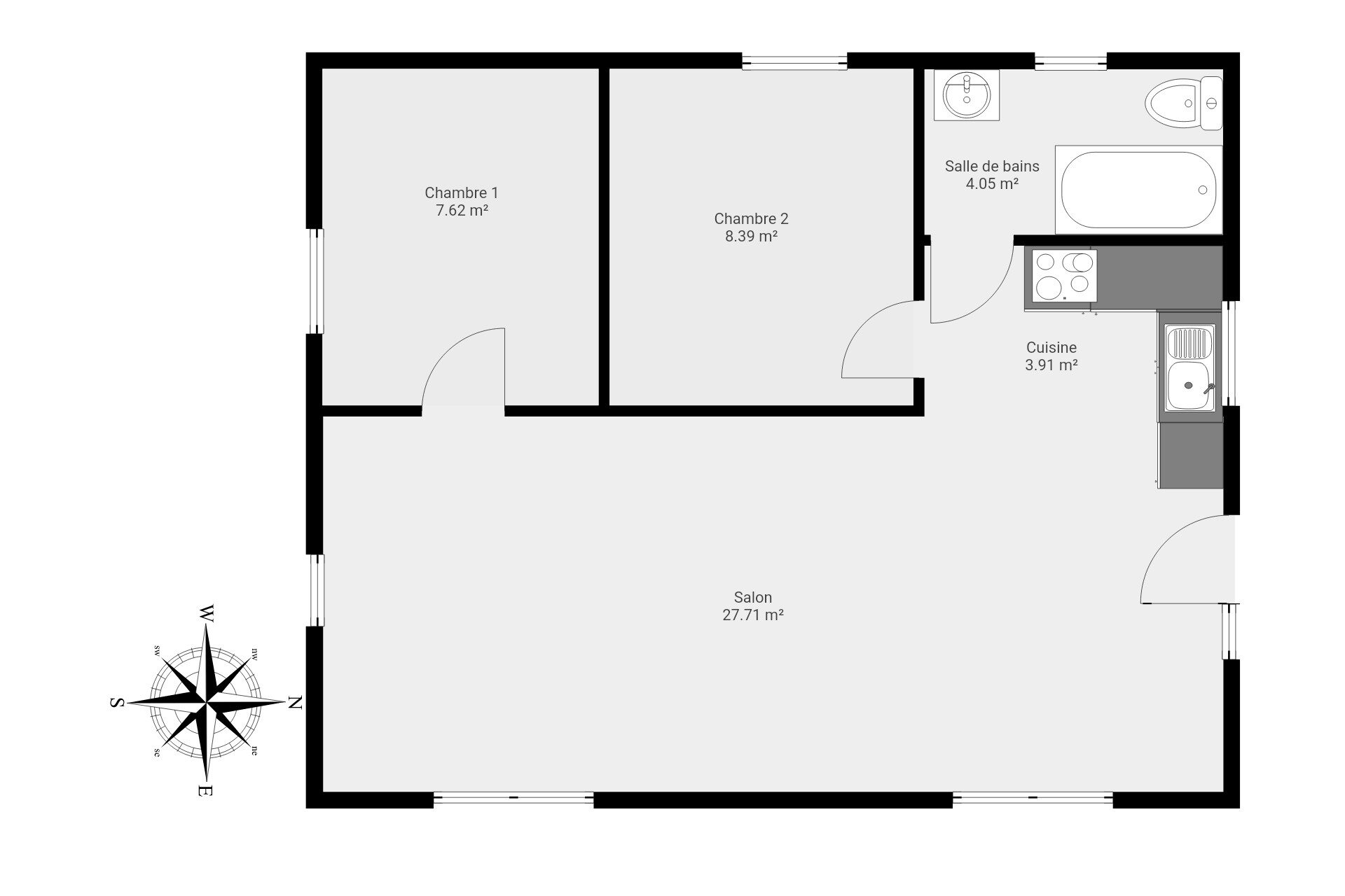 Composition : pièce de vie, coin cuisine, 2 chambres et salle de bains.