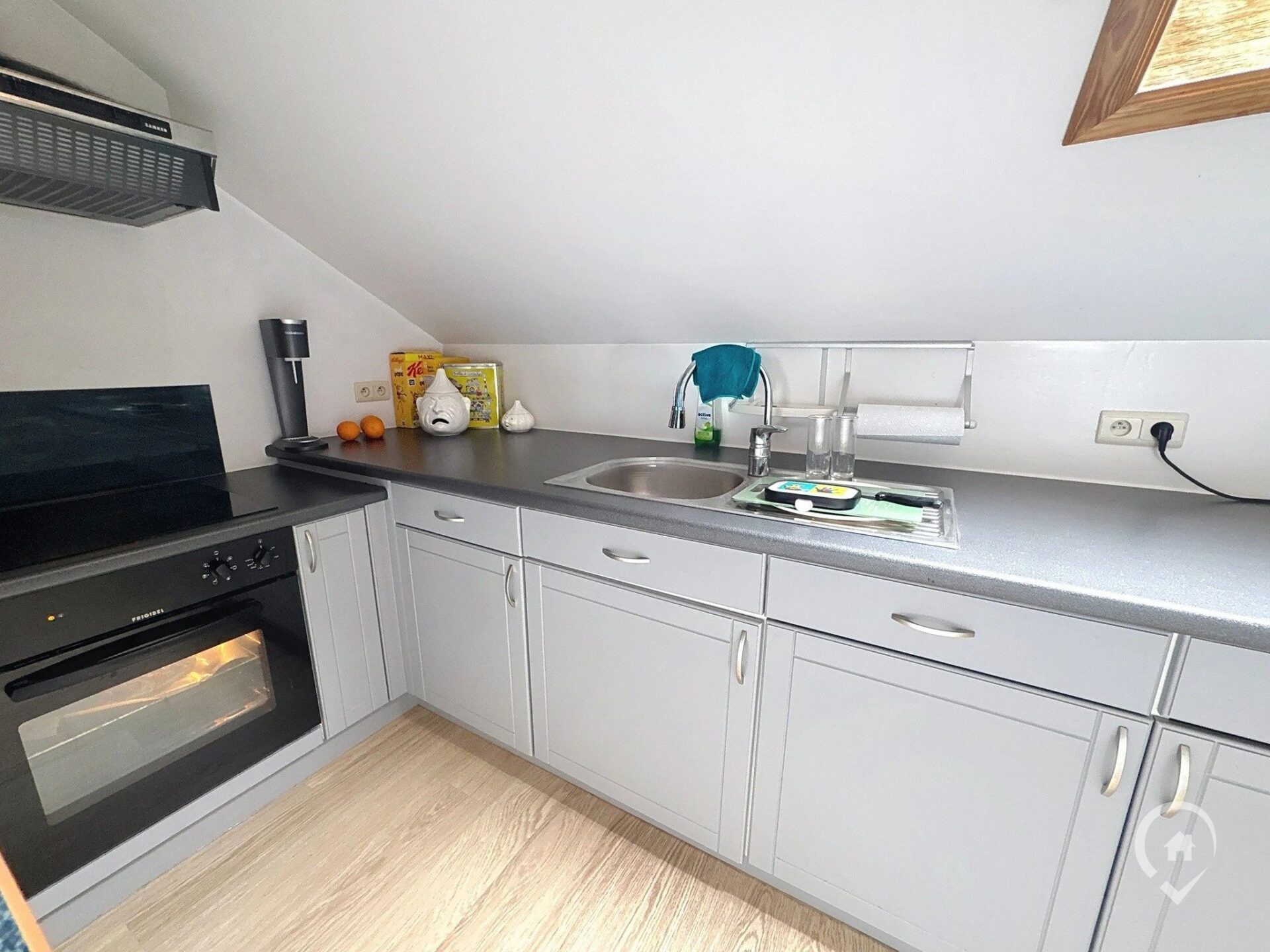 – Etage : hall de nuit, salon, cuisine équipée, 1 bureau, 1 chambre, salle de bains, grenier ;
