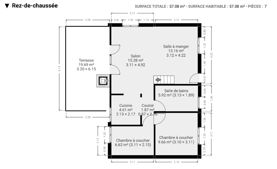 – Rez-de-chaussée : salle à manger, grand living avec cuisine ouverte, 2 chambres, 1 salle de bains et une magnifique terrasse de 20m² avec coin barbecue ;