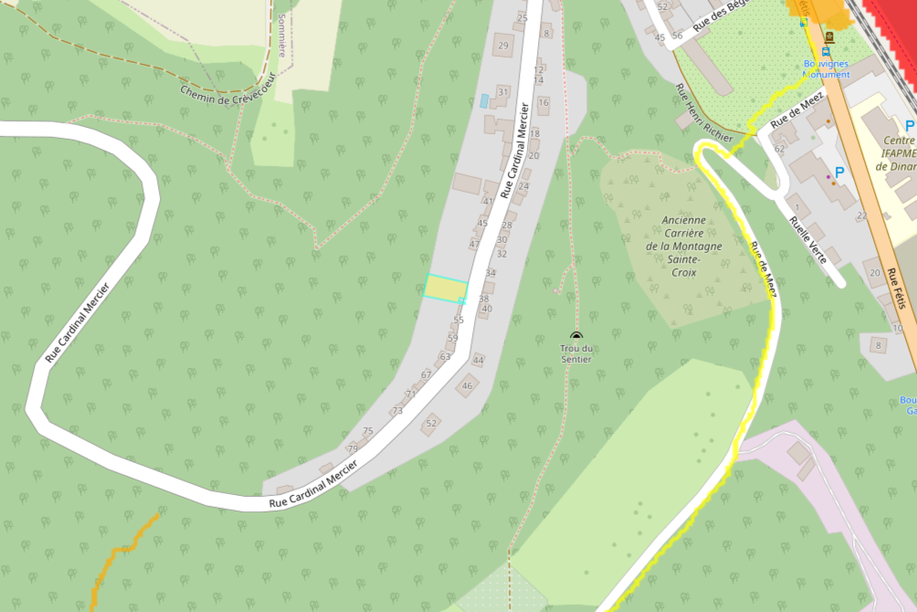 Superficie totale du terrain 6,55 ares – Largeur de 18m de façade et 35m de profondeur – Orientation arrière : Ouest – Zone d’habitat et le fond en zone forestière au plan de secteur – Environnement : Résidentiel – Dénivelé : terrain composé de 4 plateaux – Raccordement aux impétrants : Eaux / Electricité / Egout – Proximité des commerces et facilités : Dinant à 5Km – Accessibilité : gare de Dinant à 3Km/N97 à 10′ et E411 à 15′ – Libre d’occupation et de construction.