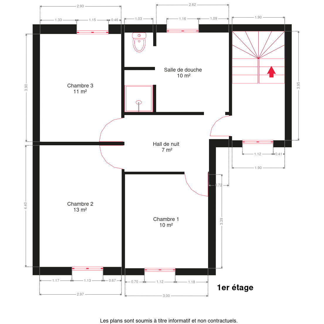 Premier étage: Hall de nuit, 3 chambres à coucher, salle de douche.