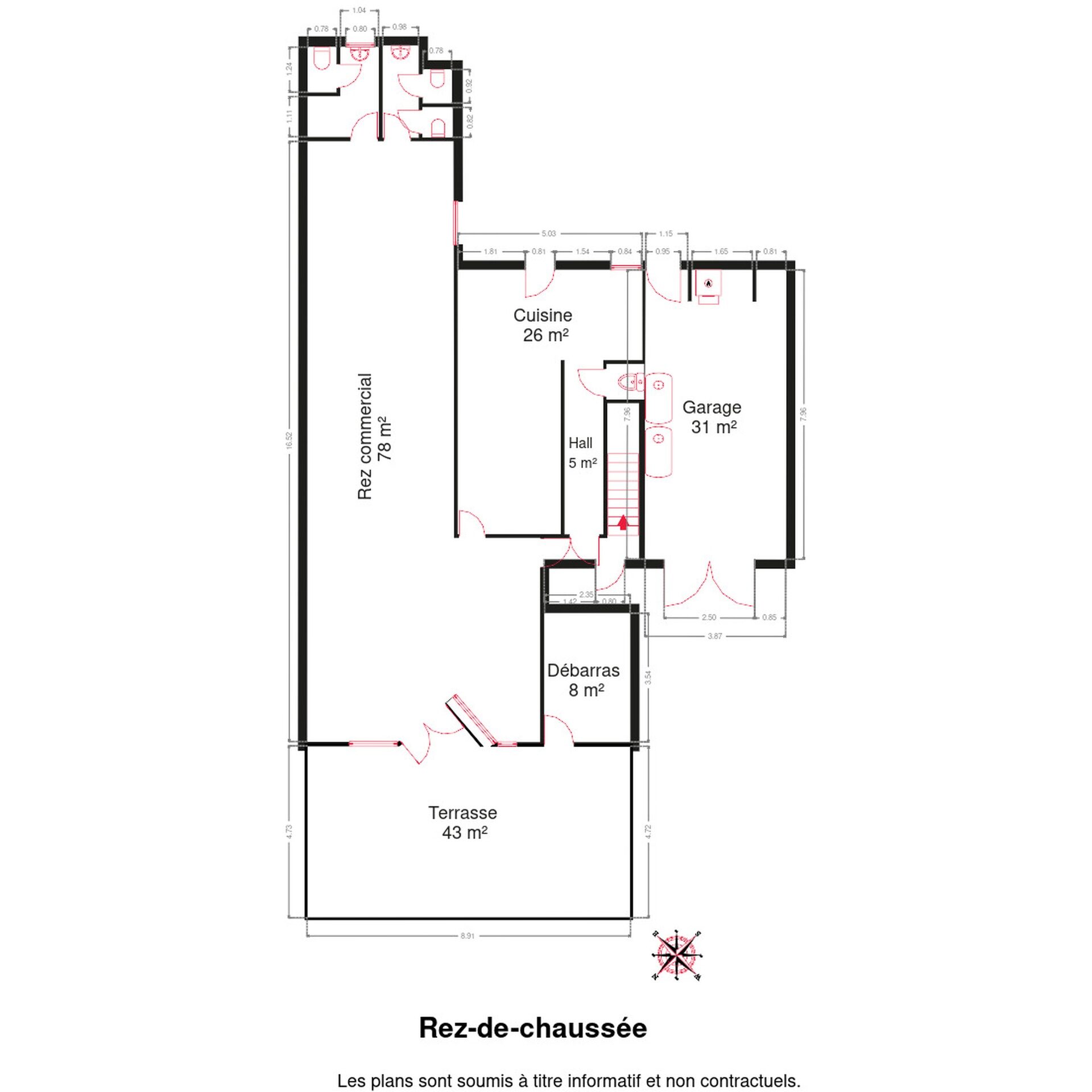 – Rez-de-chaussée : hall d’entrée privative, salle principale de 77m² avec coin bar, cuisine, sanitaires, débarras ;