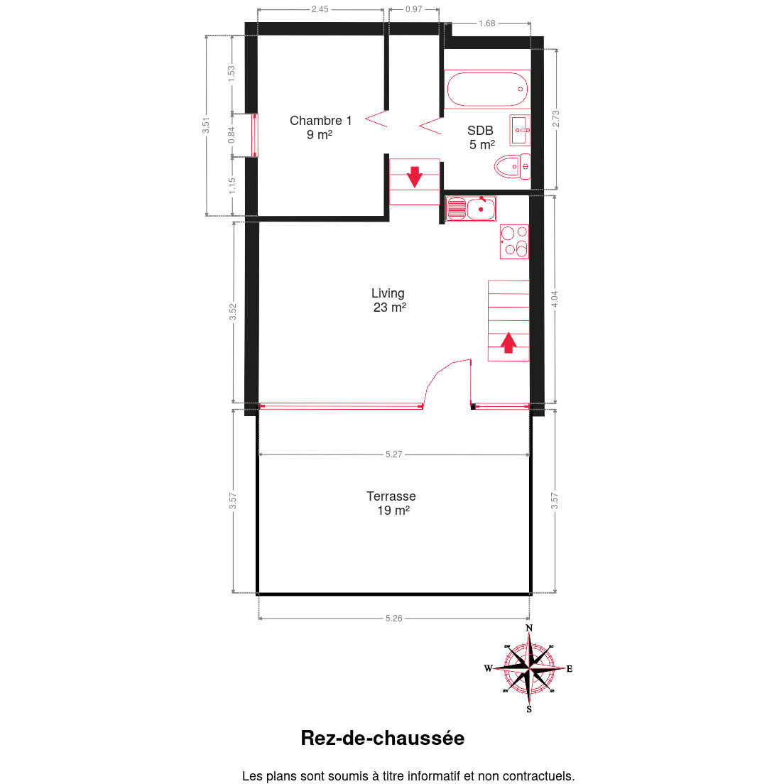 Composition: séjour lumineux avec un accès directe sur la terrasse, cuisine équipée, 2 chambres, et salle de bain.