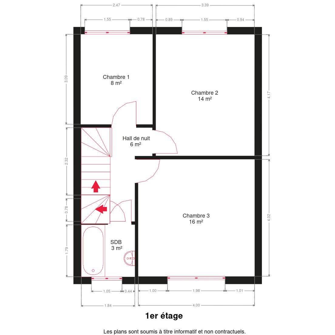 – 1er étage : hall de nuit, 3 chambres, salle de bains ;