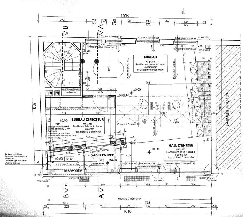 – Rez-de-chaussée – Rue du Matoufé : salle de réunion, cuisine équipée, double WC indépendant, local technique, hall d’entrée commun pour le duplex et le studio, ainsi qu’un accès vers la salle de réunion.