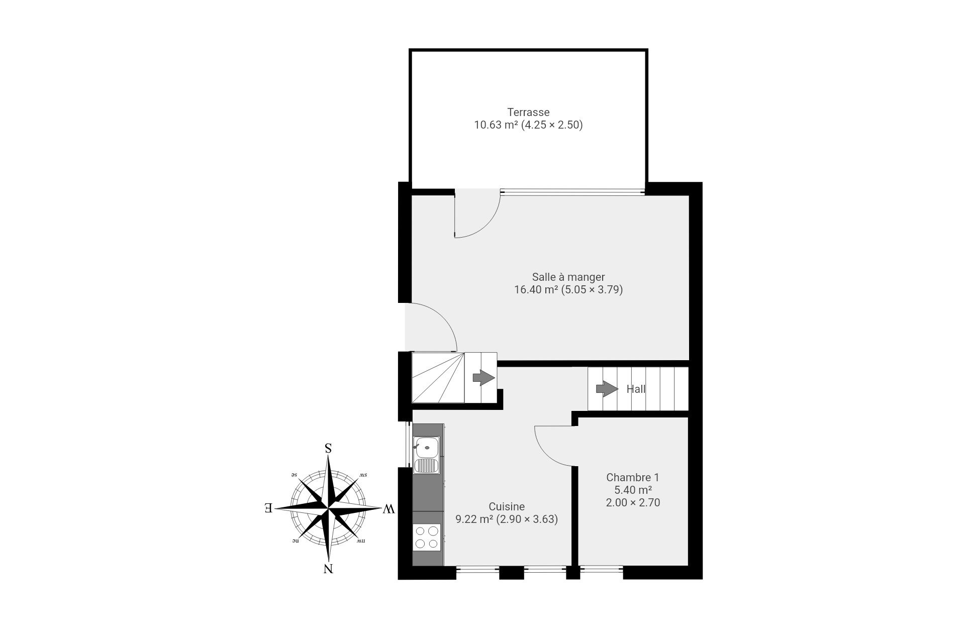 – Rez-de-chaussée : salon lumineux, bénéficiant d’un accès directe sur terrasse en bois exposée plein sud, une cuisine équipée avec coin repas, 1 chambre ;