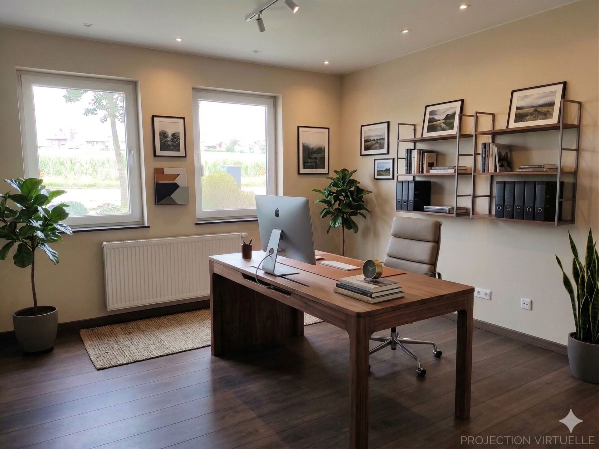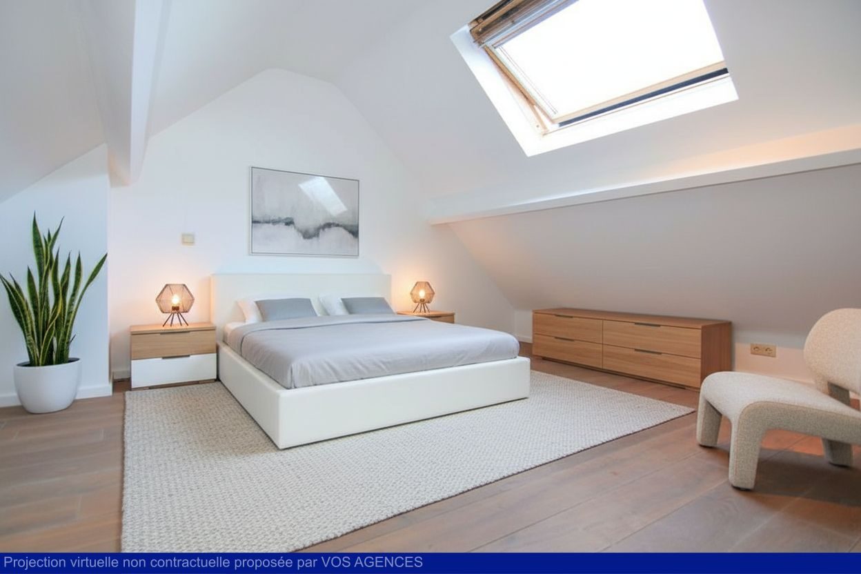 A l’étage : spacieuse salle de bains avec bain et douche italienne, chambre, palier pouvant servir d’espace bureau, chambre ou salon.