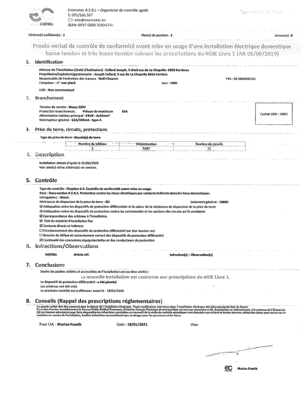 Équipements : chauffage central au gaz propane avec chaudière individuelle, châssis en PVC double vitrage, nouvelle toiture isolée, crépi isolant sur l’ensemble du bâtiment, électricité conforme jusqu’en 2046.