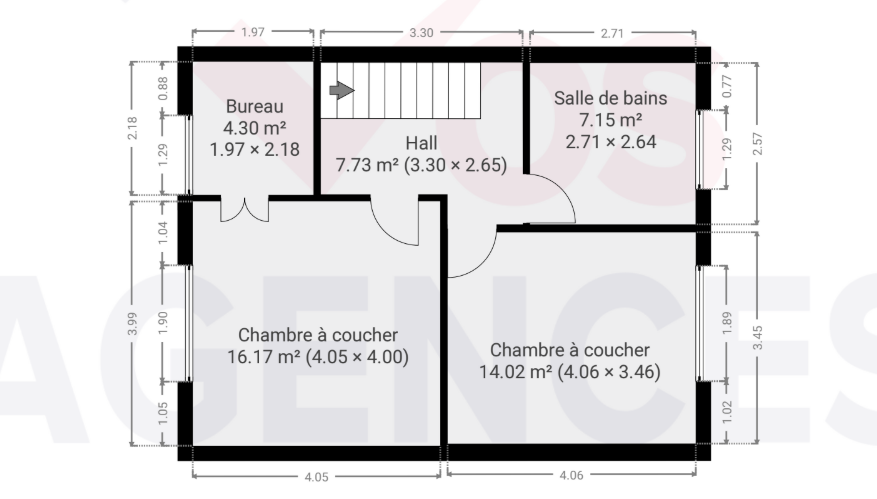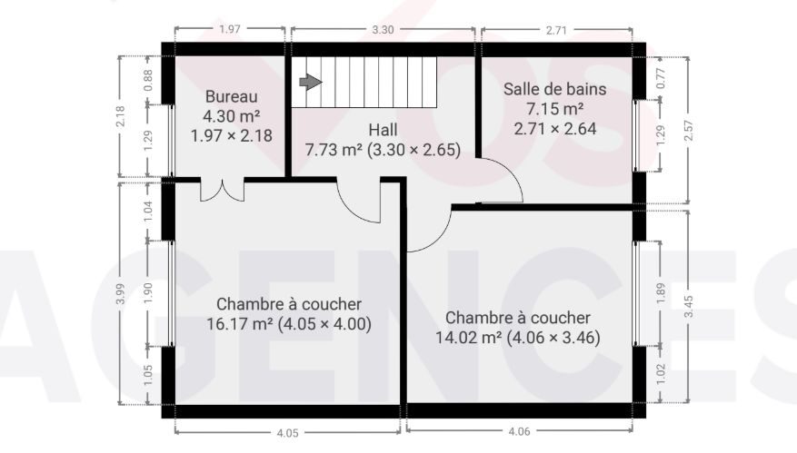 – 1er étage : hall de nuit, 2 chambres dont une avec une possibilité de dressing ou bureau, salle de bains ;
