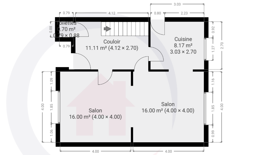 – 2e étage : grenier aménageable avec un accès via une cage d’escalier et entièrement sur dalle de béton ;