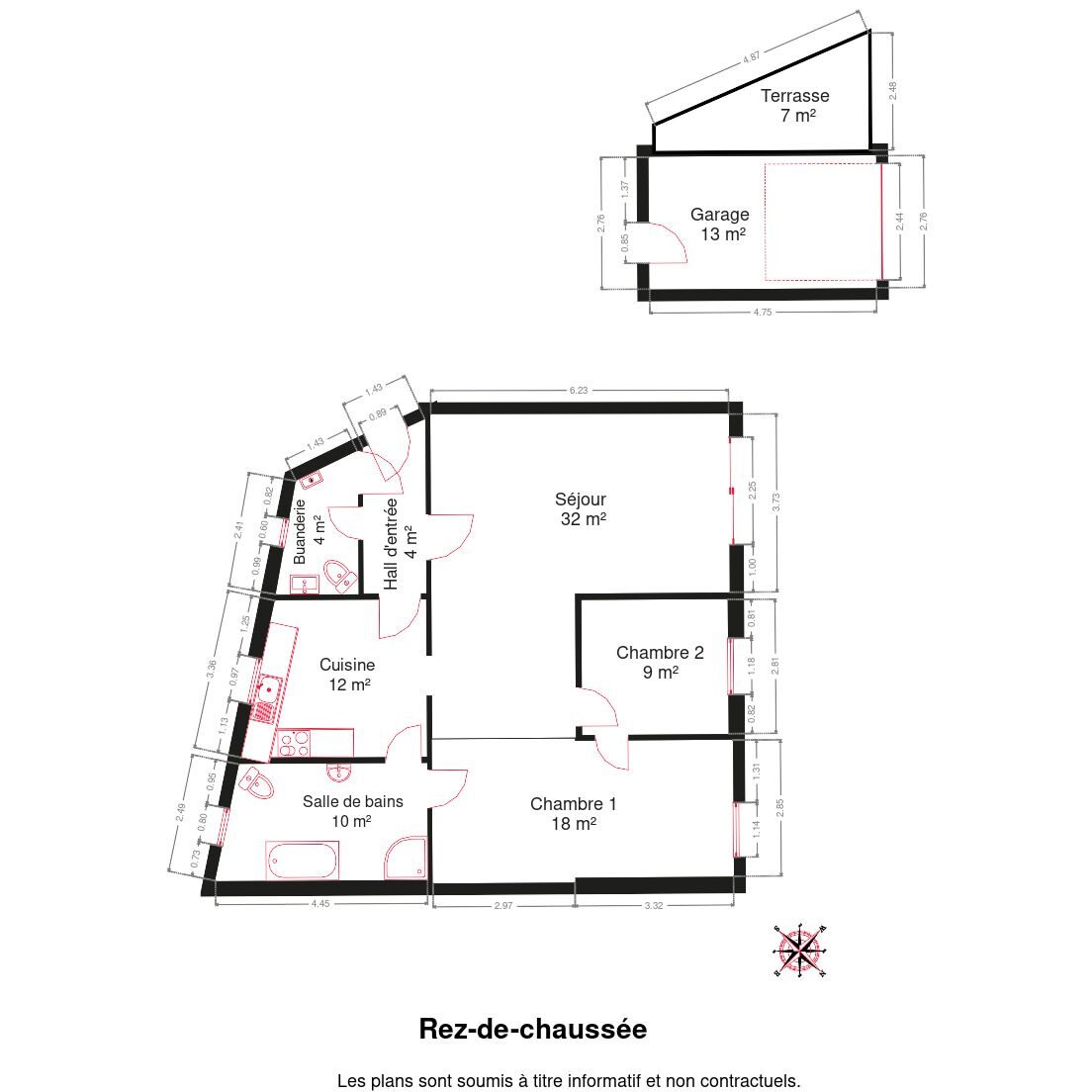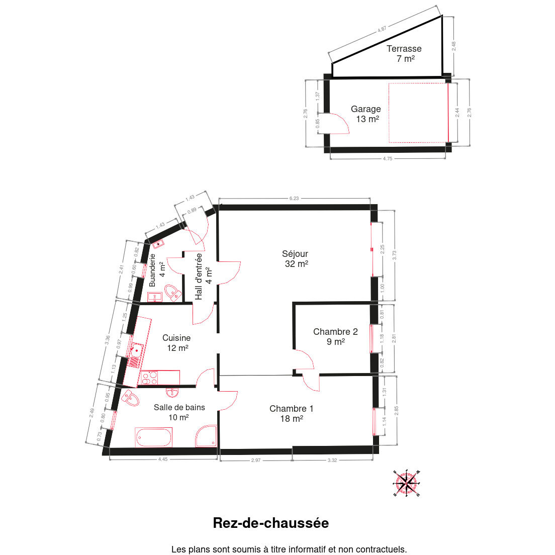 Composition du bien : hall d’entrée, séjour de 32 m² avec accès direct à la terrasse, cuisine équipée, 2 chambres, salle de bain, buanderie et un garage indépendant.