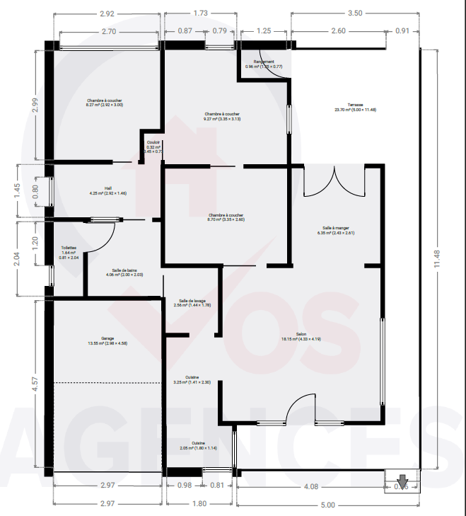 Composition du bien : salon, salle à manger, cuisine, arrière-cuisine, salle de douche, WC indépendant, 3 chambres, terrasse