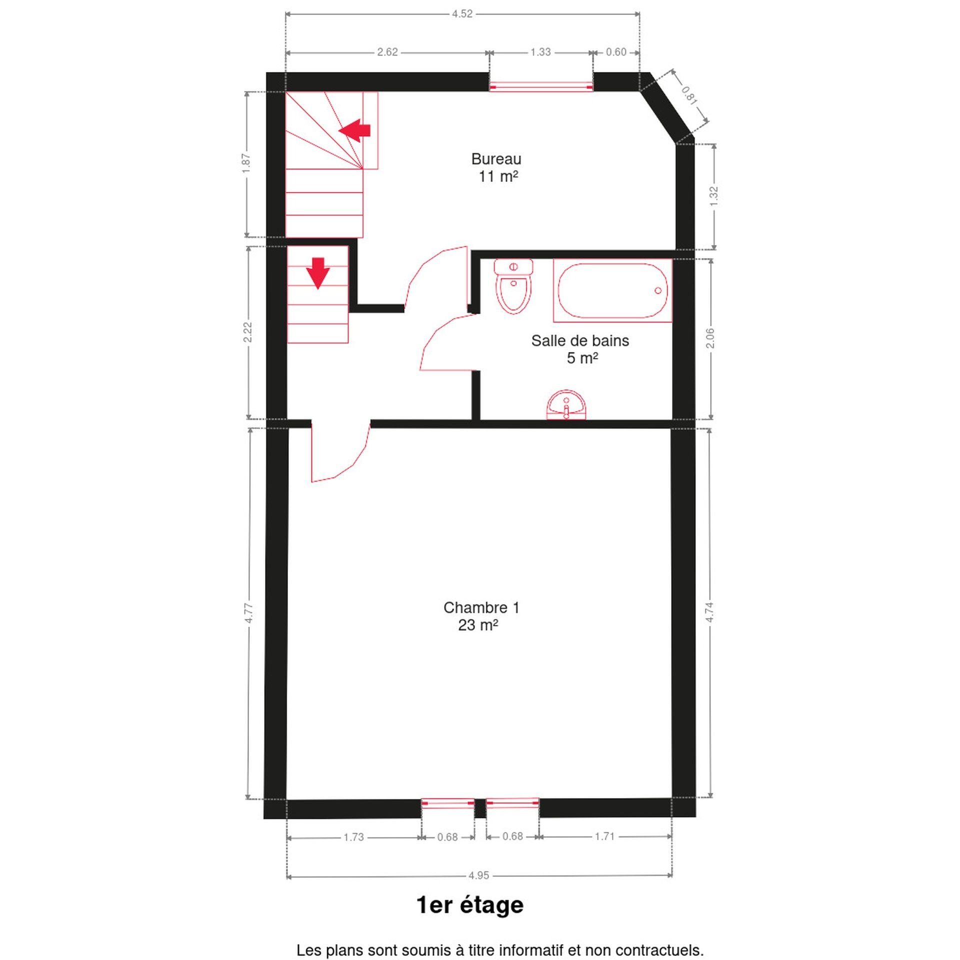 – 1er étage : hall de nuit, 1 chambre de 23m², 1 bureau, salle de bains ;