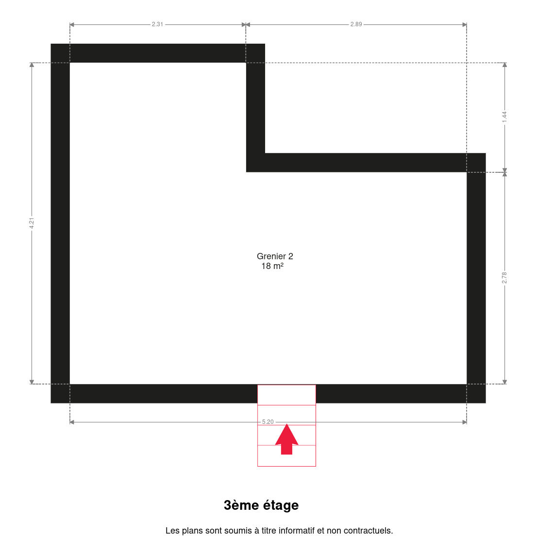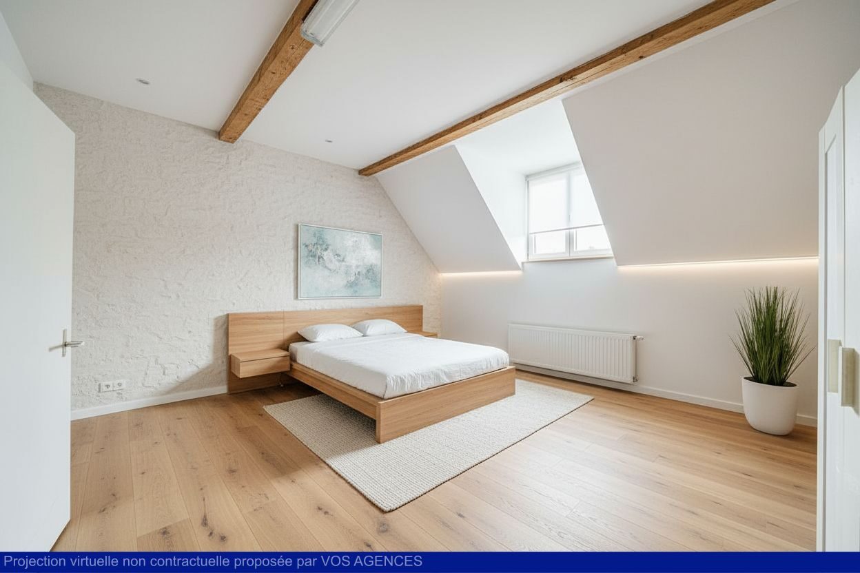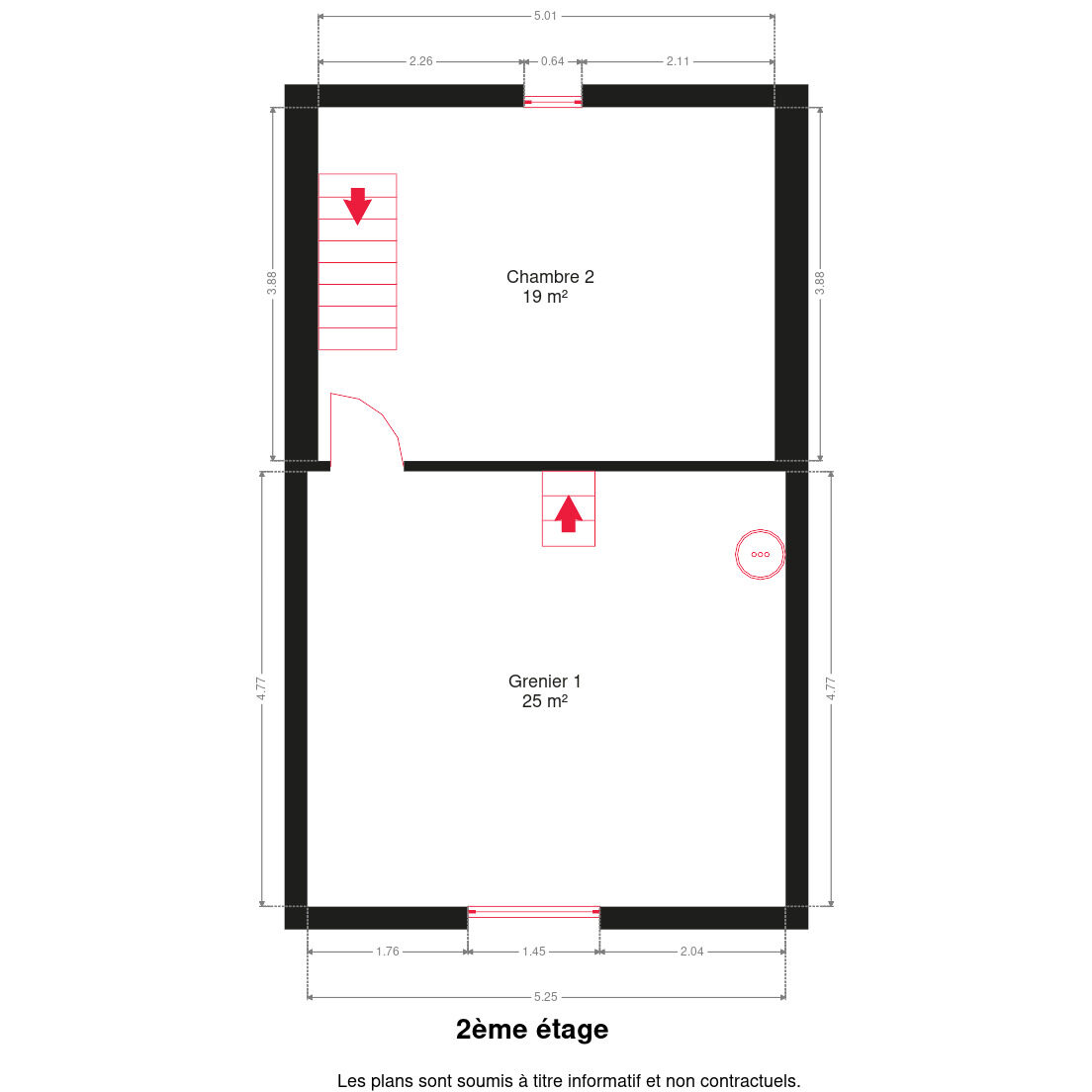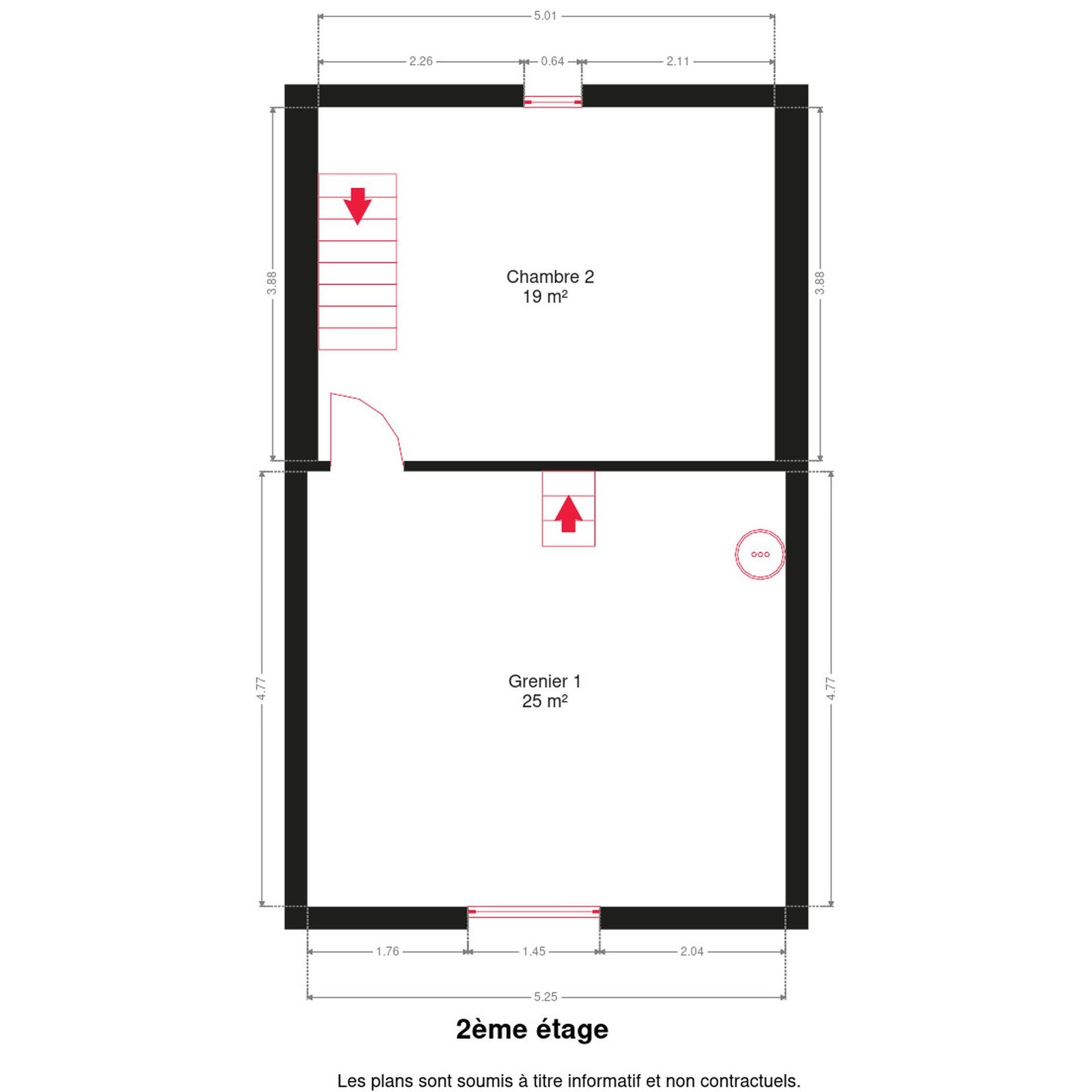 – 2e étage: 1 chambre de 19m², grenier aménageable de 23m² et un second grenier de 18m².
