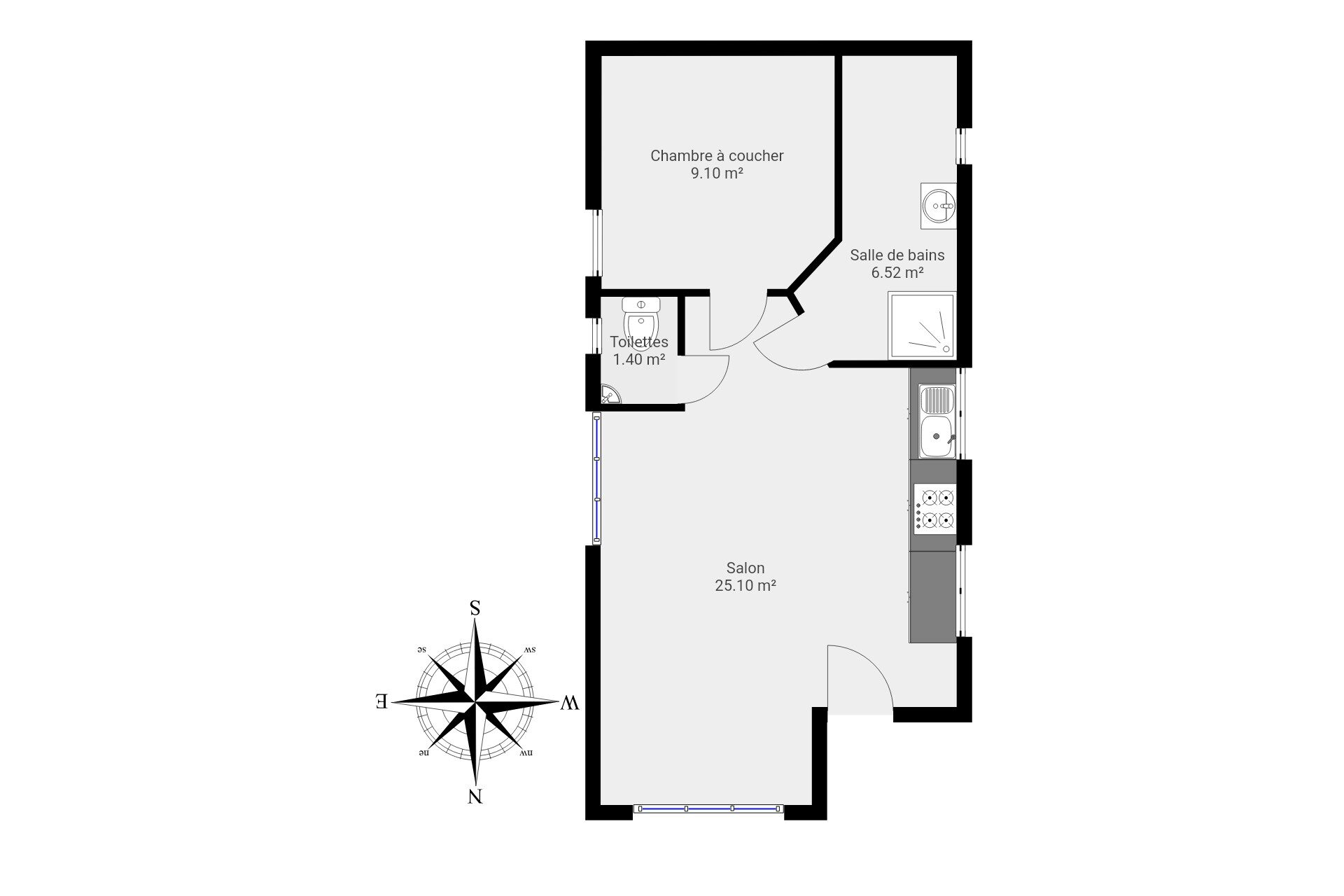 Samenstelling: woonkamer, half uitgeruste keuken, 1 slaapkamer, 1 douchekamer en apart toilet.